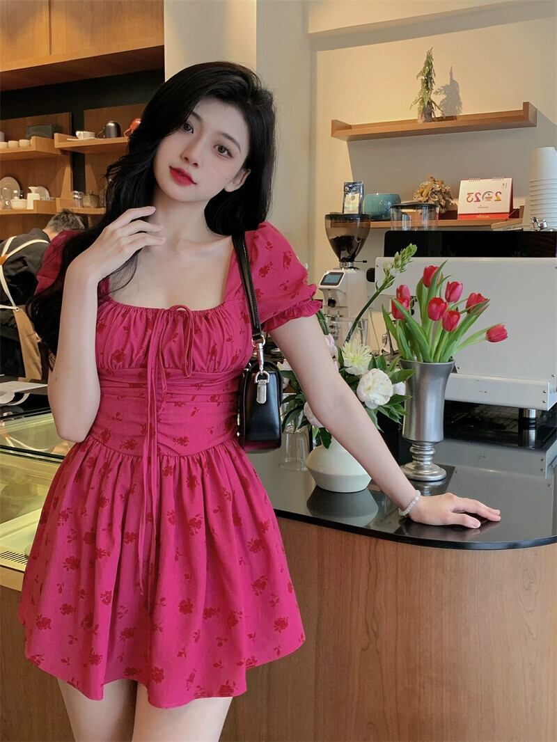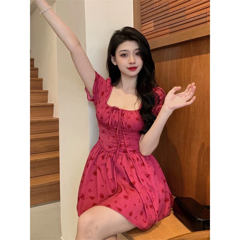 スクエアカラー花柄ドレスレディース夏新作フレンチウエストウエストステッチデザインセンスネクタイAラインショートスカート サマー 夏物 スクウェア missk50981662294