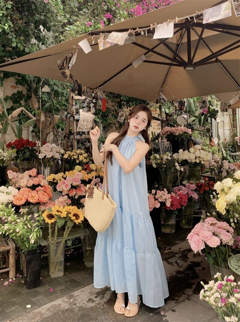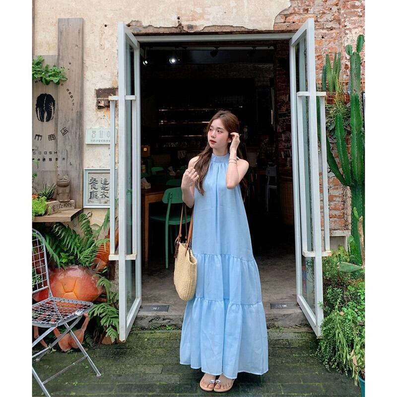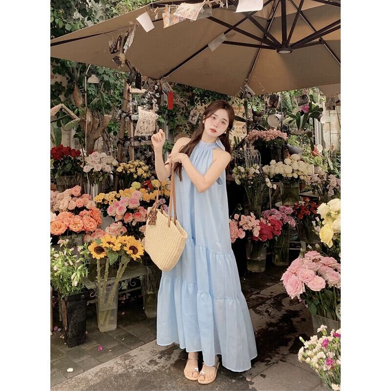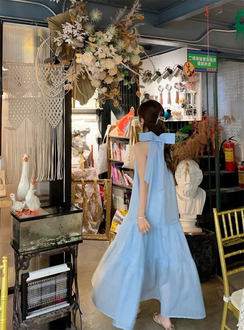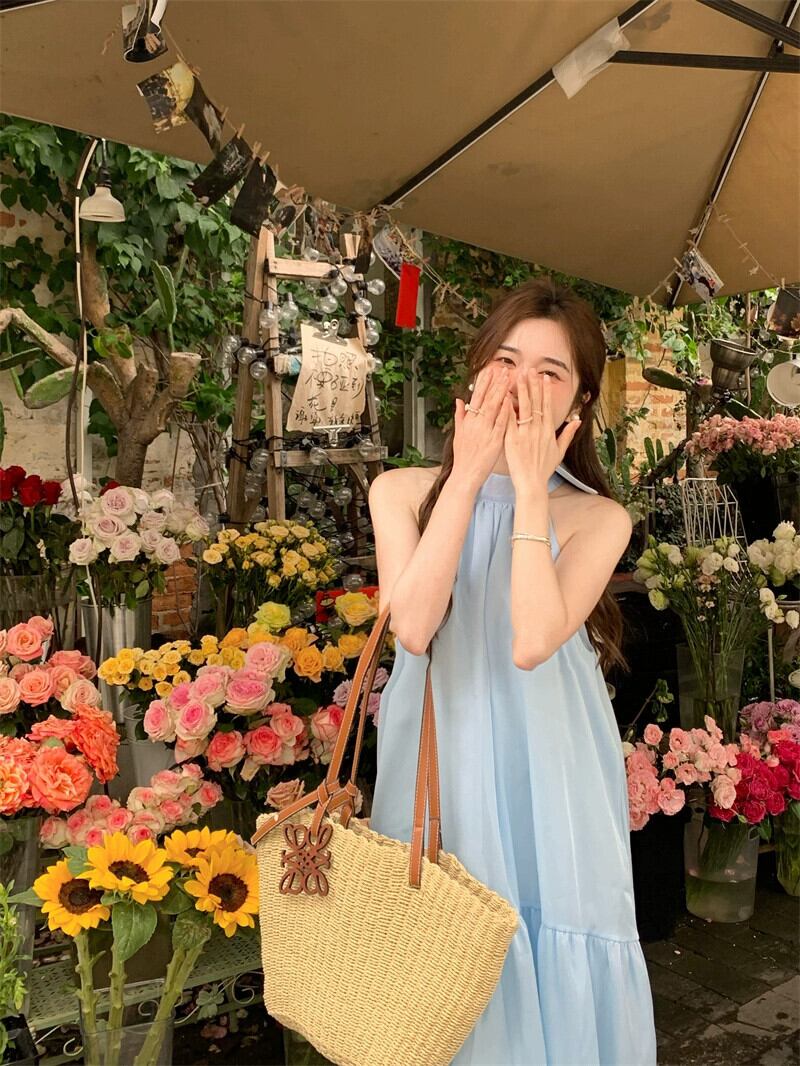 ホリデースタイルぶら下げネックサスペンダードレス女性の夏の新しいフレンチハイウエストリボンブルーロングスカートシック ハイウェスト サマー 夏物 missk37134453025