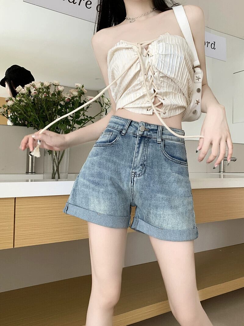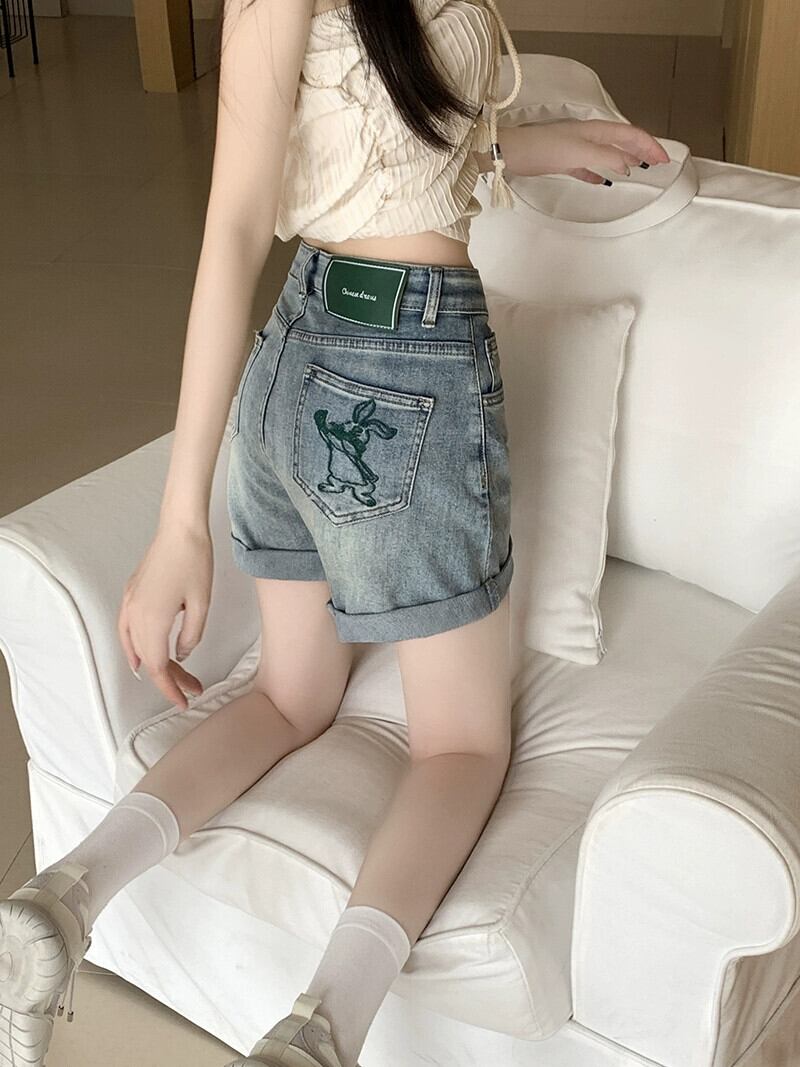 -ウエストカーリングバッグヒップ弾性デニムショートパンツ女性夏バージョン2023新しいデザインセンス刺繍アウターパンツ エラスティック 伸縮 サマー 夏物 ショーツ ブルマー missk37093367965