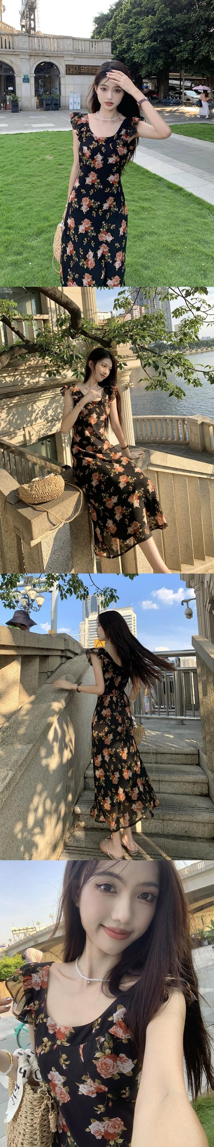 フレンチレトロ花柄ドレス女性の夏の 2023 新しいフライングスリーブデザインセンスウエストウエスト痩身 A ラインロングスカート サマー 夏物 Aライン missk9136360484