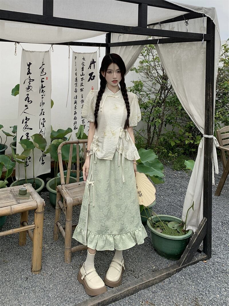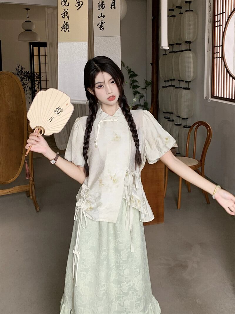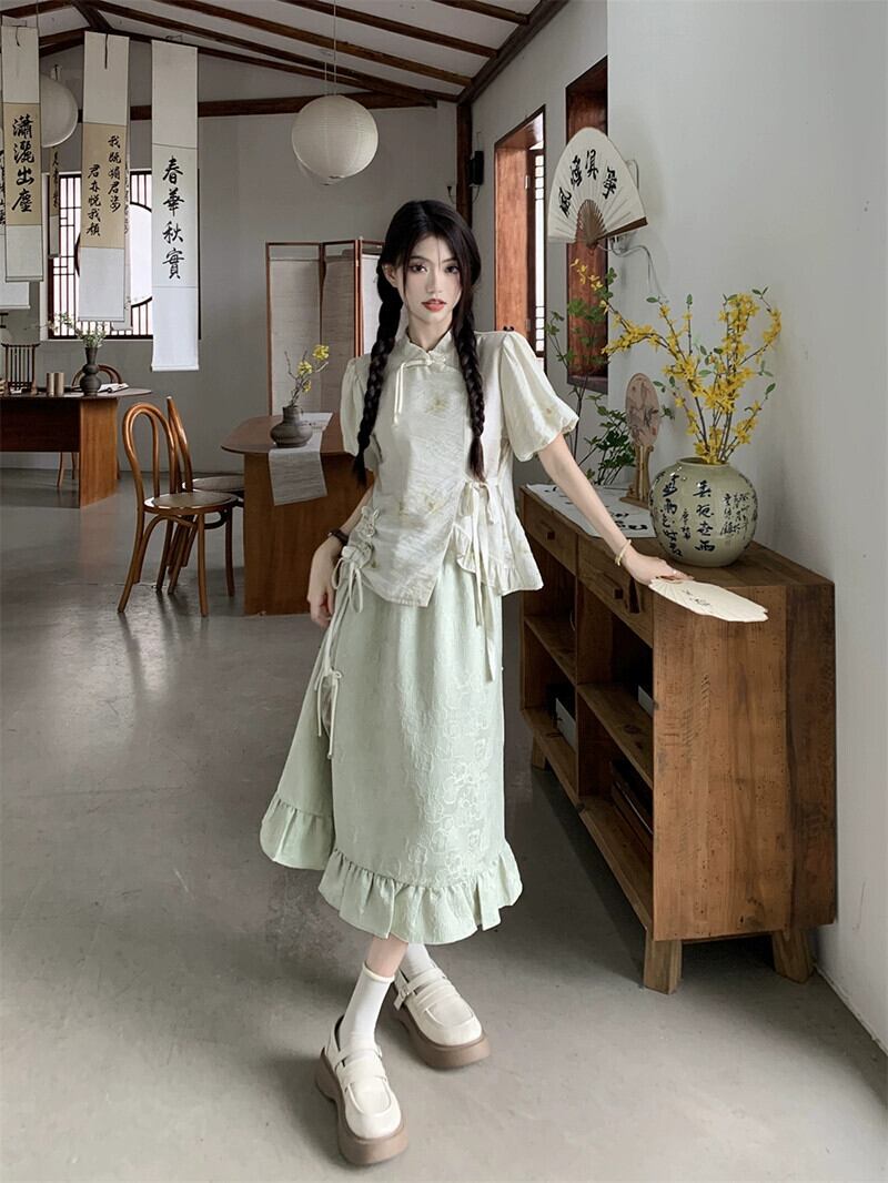 中国風の巾着バックルデザイン半袖トップハイウエスト薄いスカートの女性の夏の 2023 新しいスーツ ハイウェスト サマー 夏物 missk16295599308