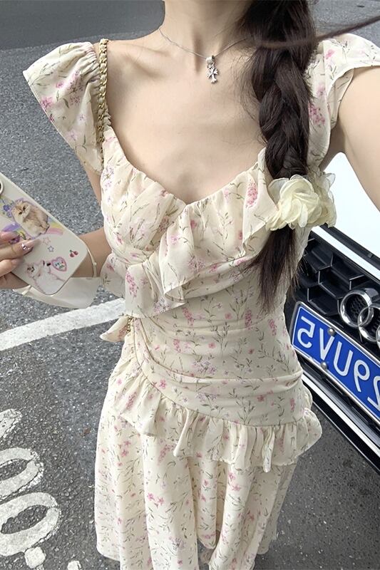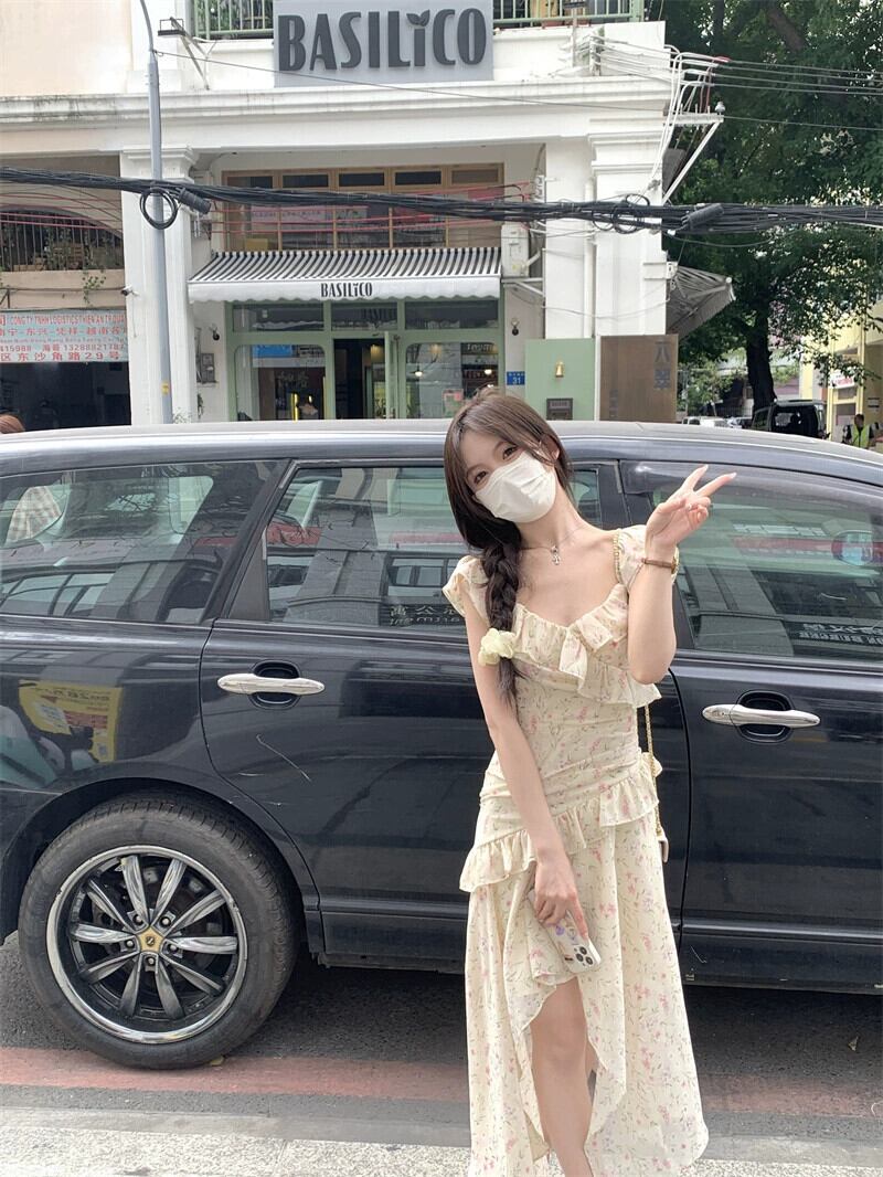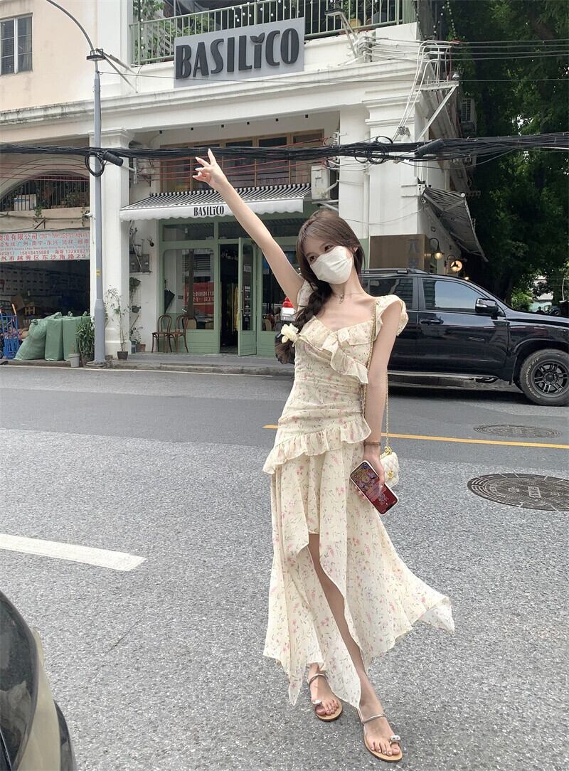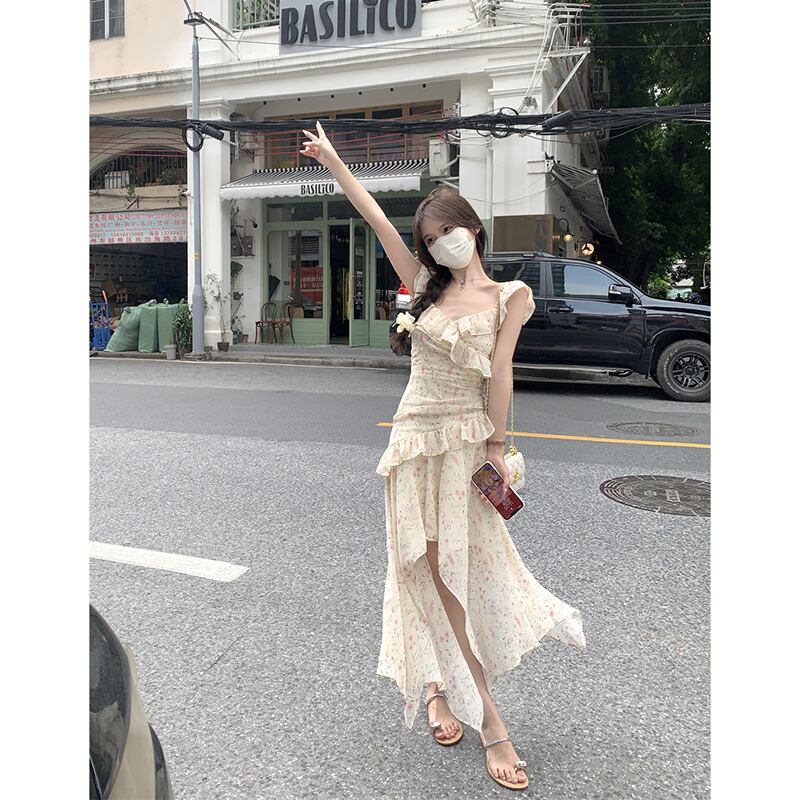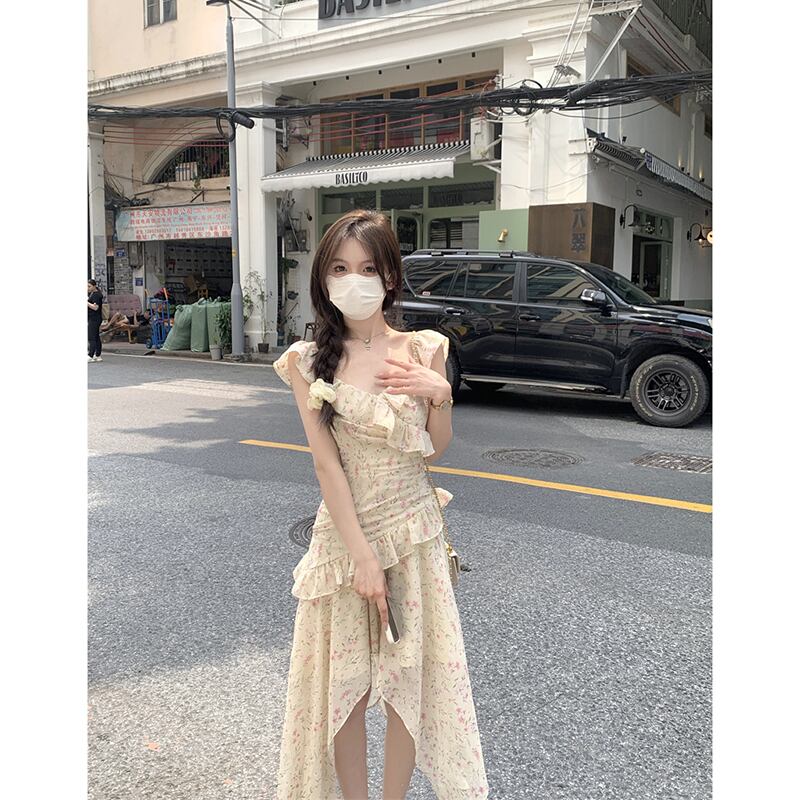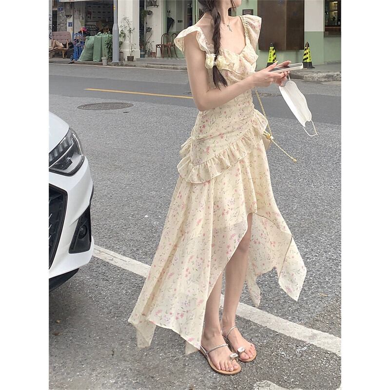 花柄小さなフライングスリーブスリングドレスの女性の夏の新しいフレンチウエストステッチ不規則なロングスカートと木の耳 サマー 夏物 missk95737871201