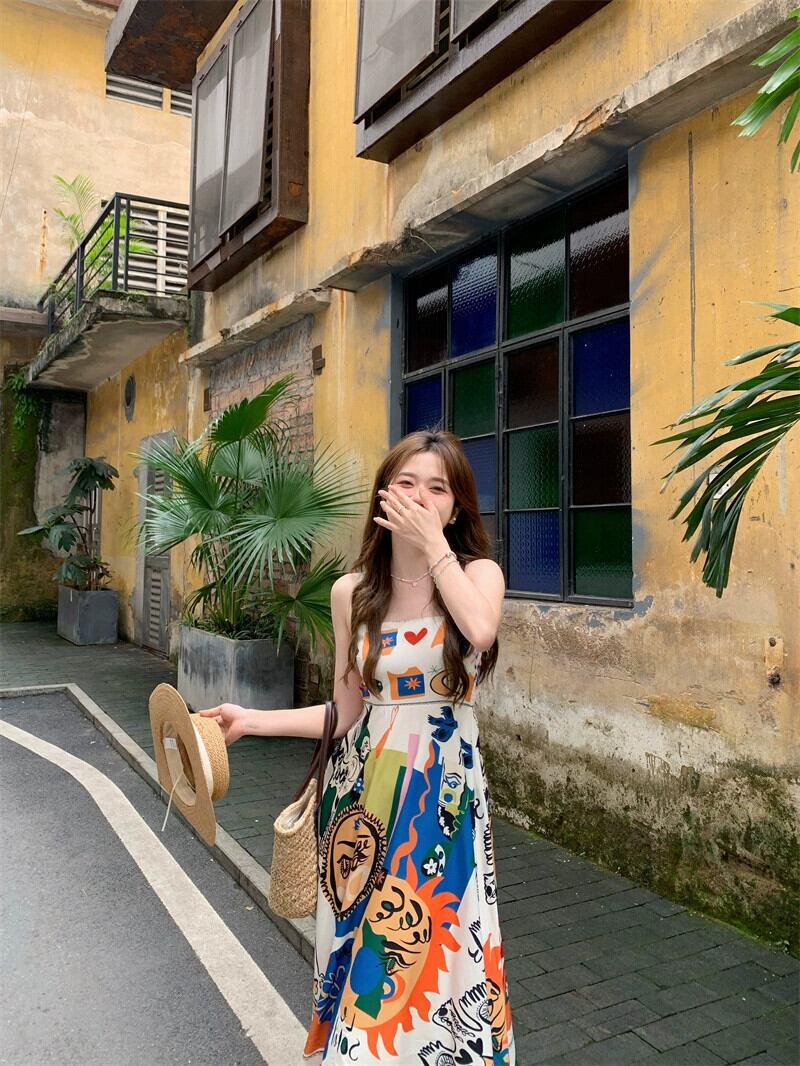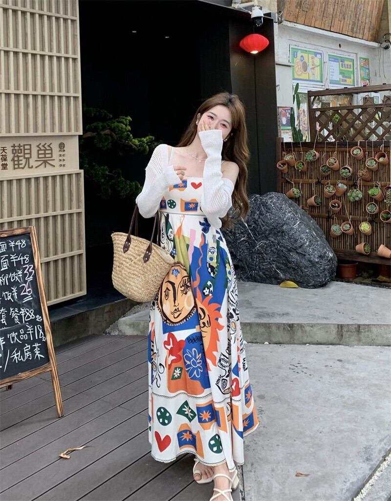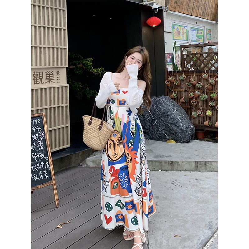 レトロエスニックスタイルチューブトップサスペンダードレス女性の夏の2023新しいグラフィティプリントミッドレングスウエストスカート サマー 夏物 missk83028485029