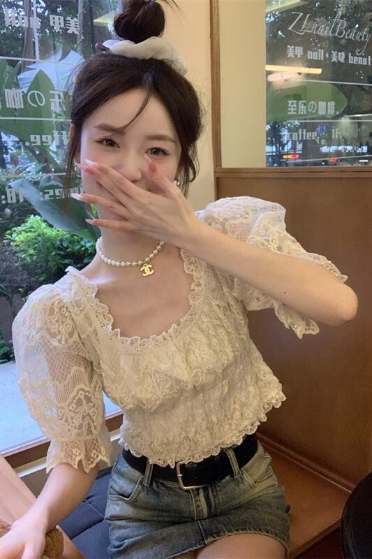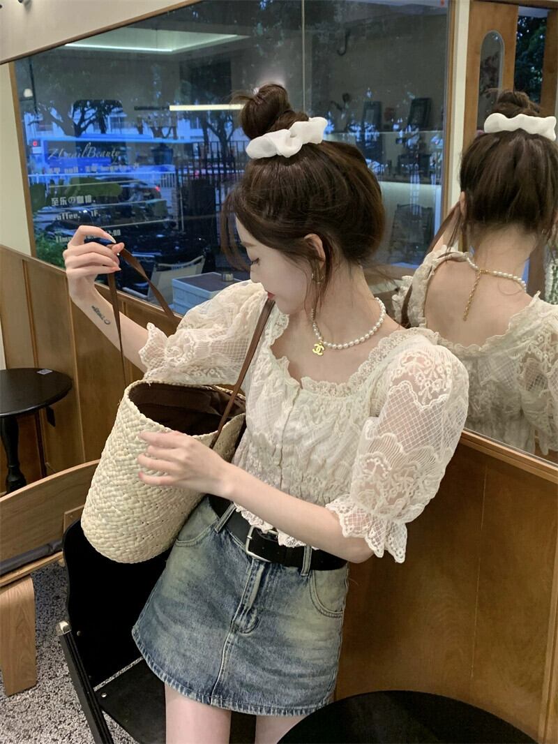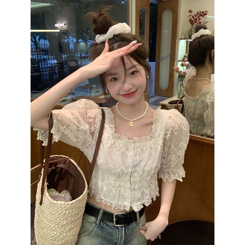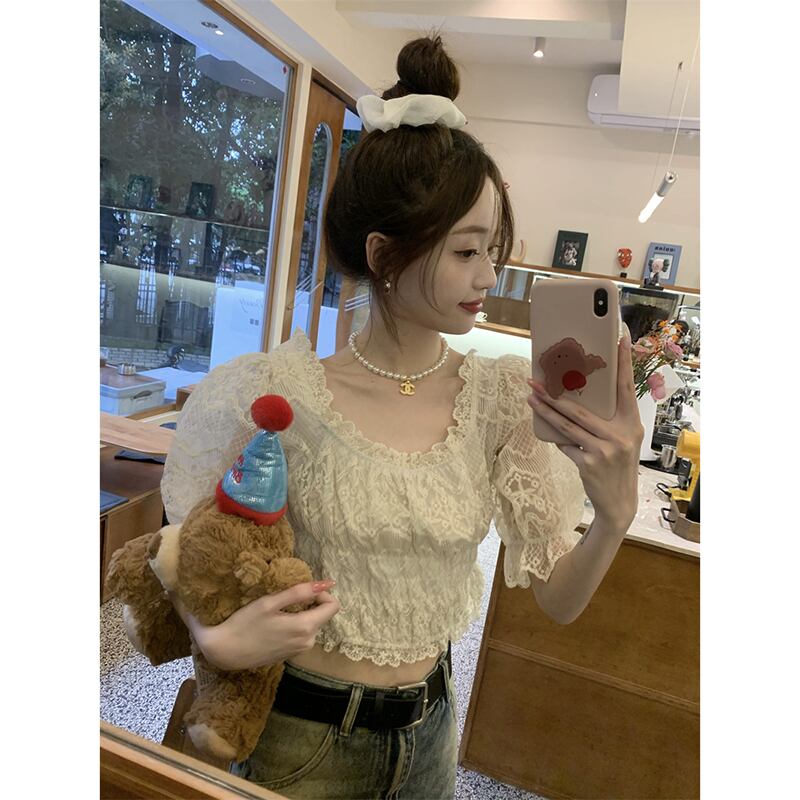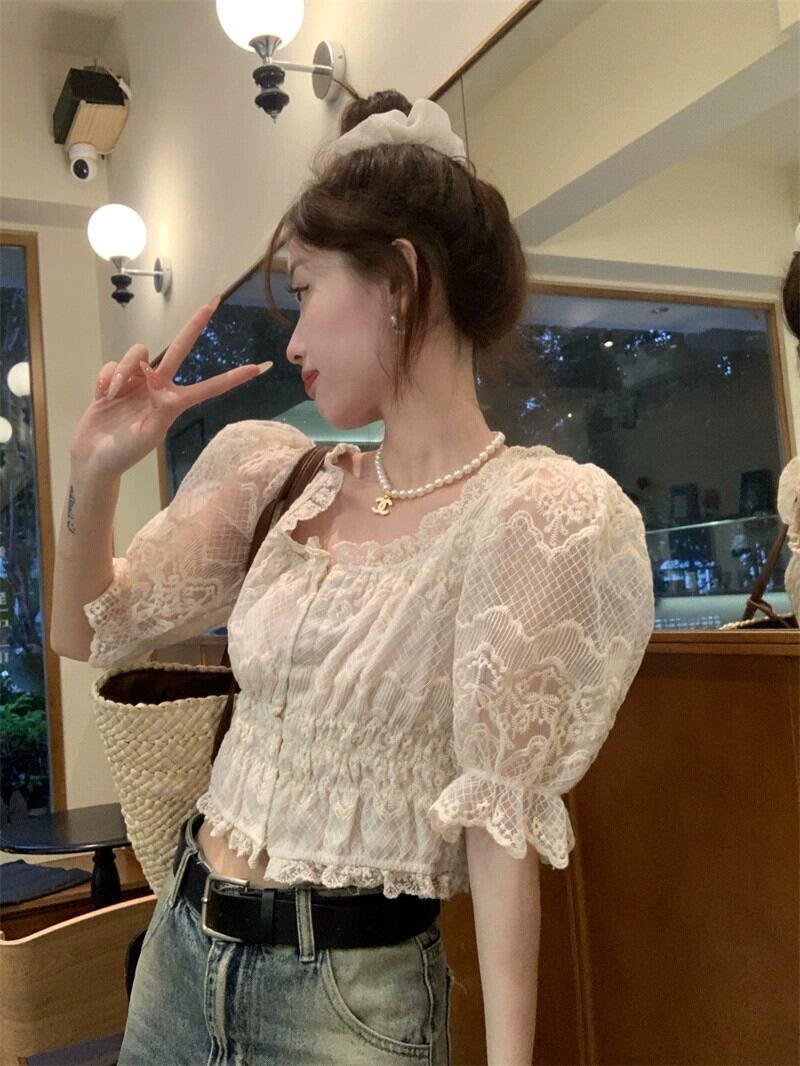 甘いスクエアネックパフスリーブレースシャツ婦人服夏 2023 前後 2 着スリムスリムシックな小さなシャツ 大人ガーリー スウィート キュート カジュアル サマー 夏物 スクウェア missk90564373157