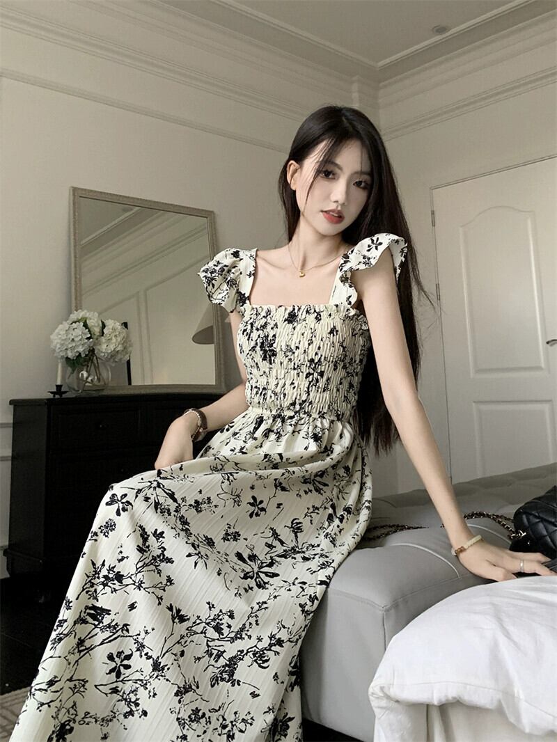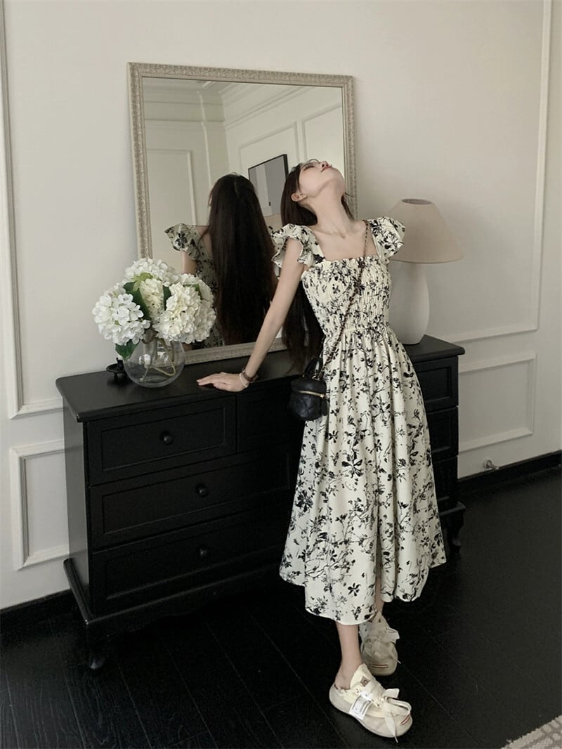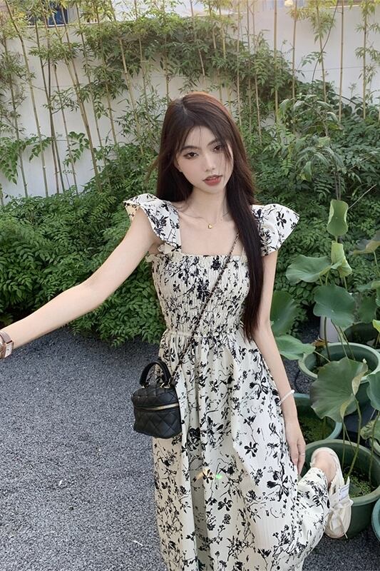 Feifei スリーブ花柄ドレスの女性の夏 2023 フレンチスクエアネック気質ウエストスリムミドルスカート サマー 夏物 スクウェア missk18292514552