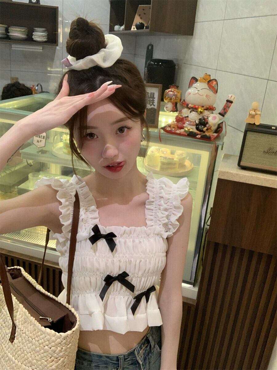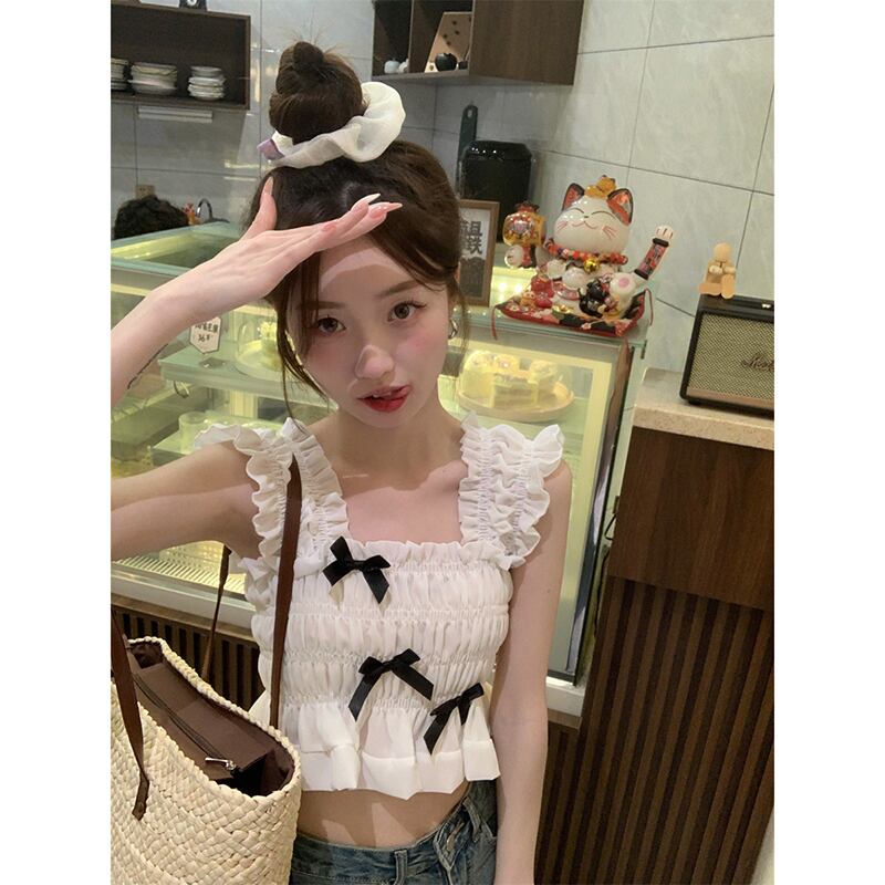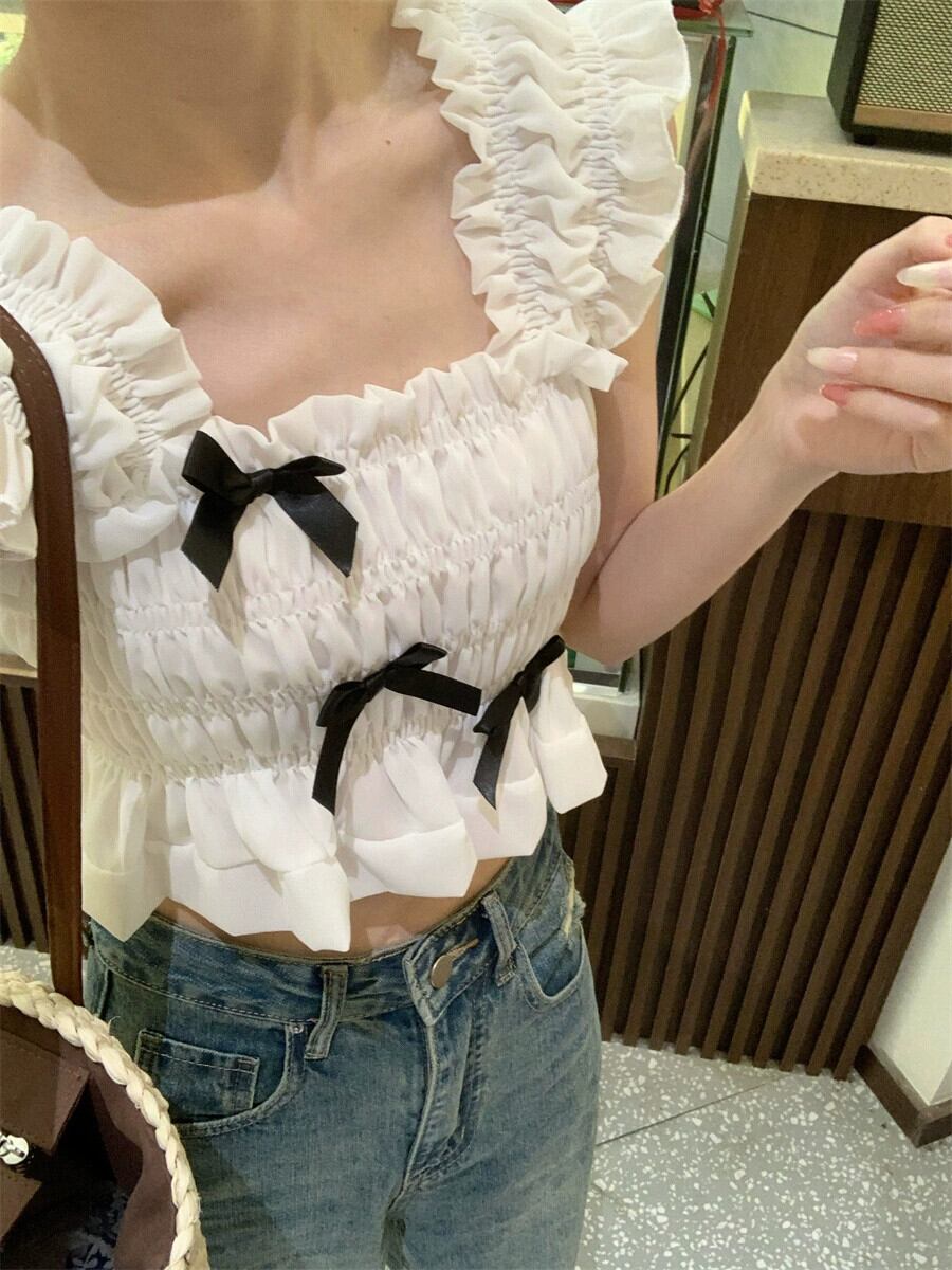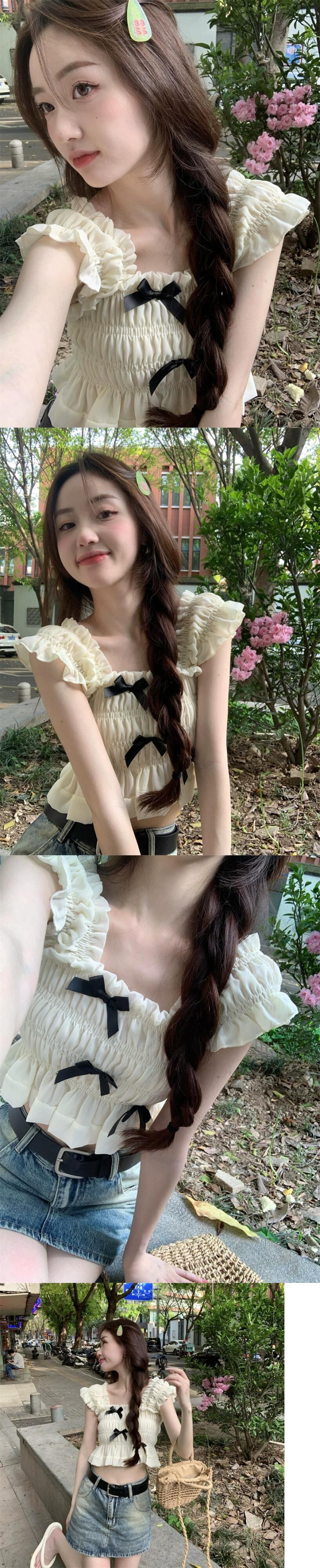甘いフランス木耳サイドノースリーブシフォンシャツレディース 2023 夏の新しいスクエアカラーリボンスリムスリムトップ 大人ガーリー スウィート キュート カジュアル サマー 夏物 スクウェア missk91051548452