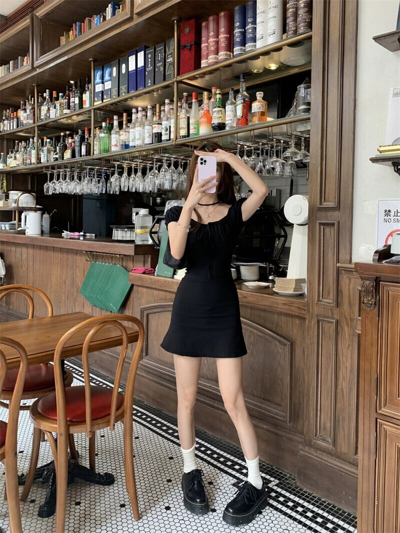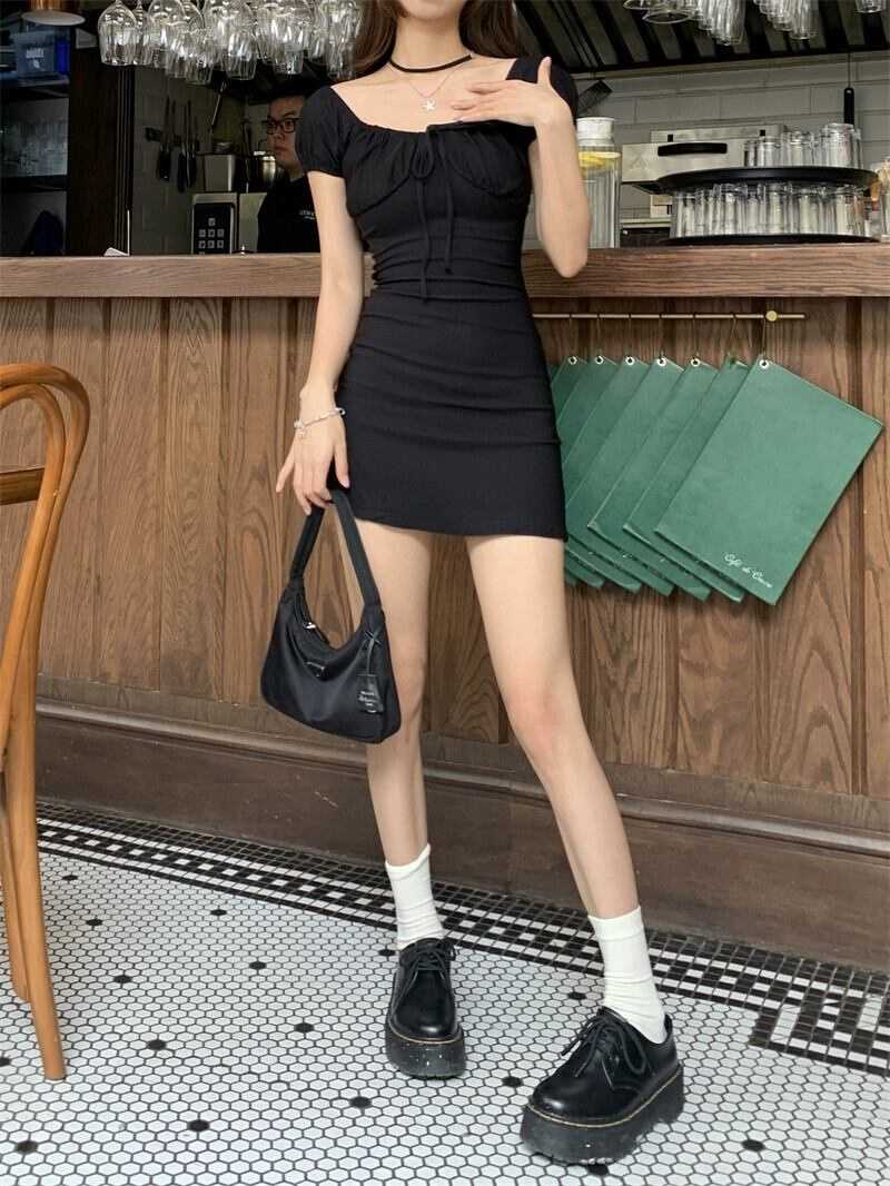 パフスリーブドレスの女性の夏の 2023 新しいフレンチウエスト痩身ネクタイ半袖バッグヒップスカートリトルブラックドレス サマー 夏物 missk75249112260