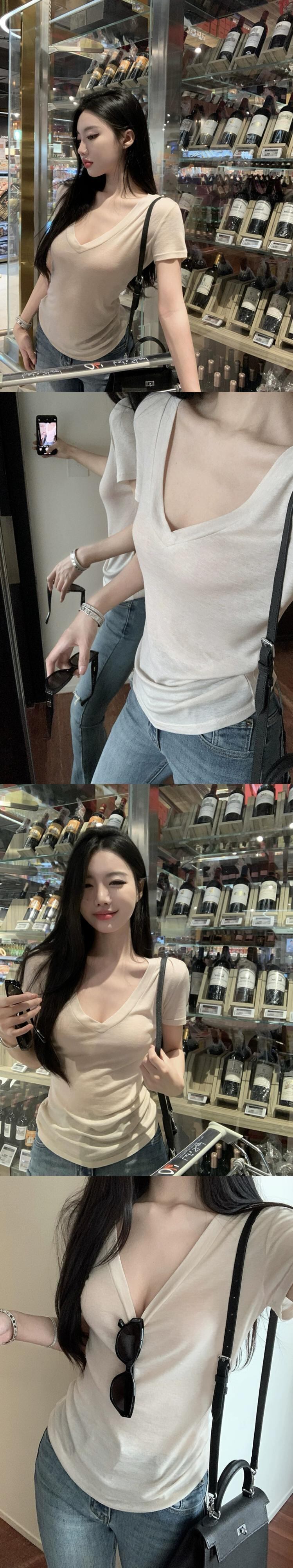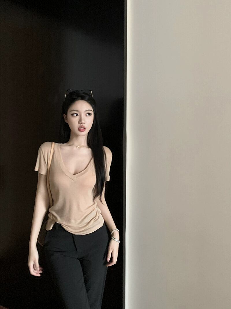 Vネック半袖Tシャツレディース夏バージョン2023新しい自己修養痩身無地インナーボトムオールマッチトップイン サマー 夏物 ソリッドカラー missk94241025412