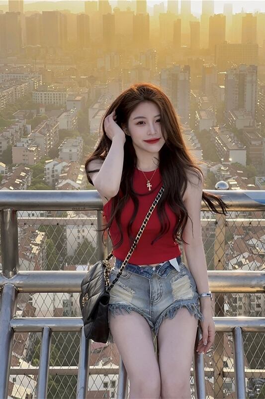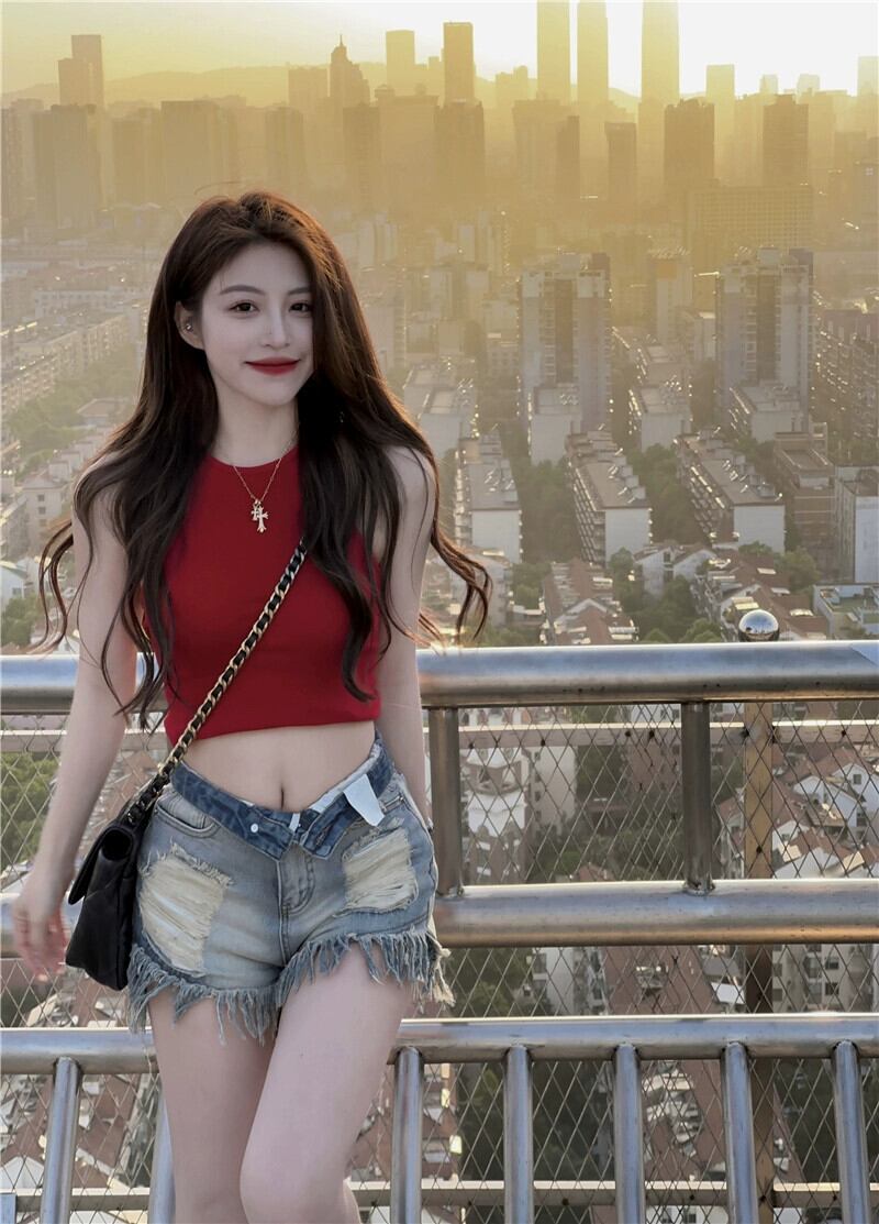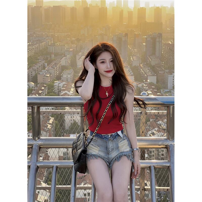色:ウォッシュドブルーショーツ,赤いホルタートップ