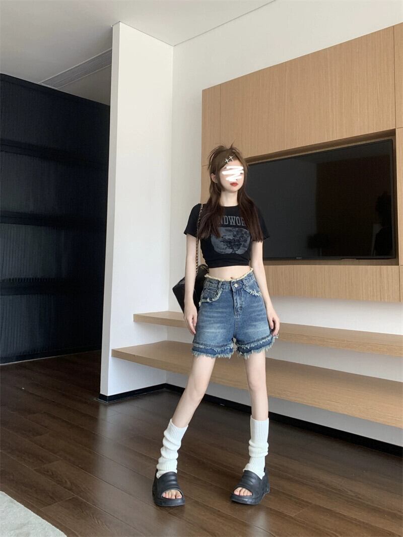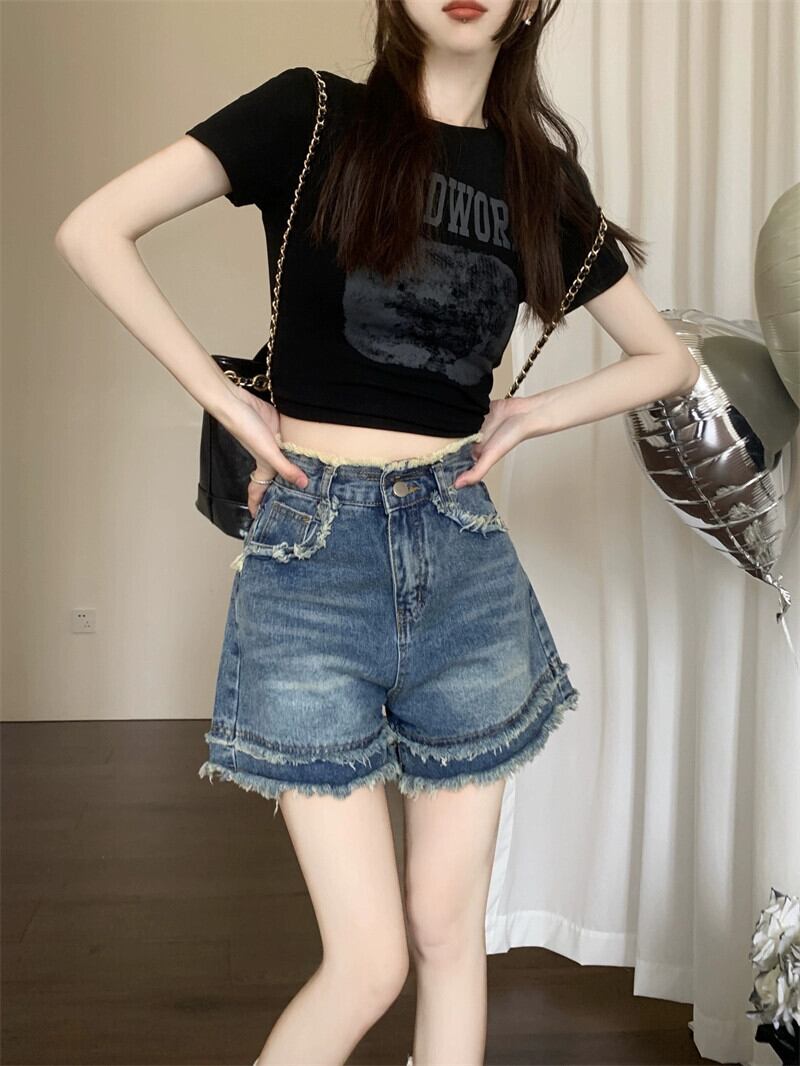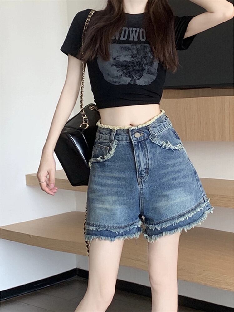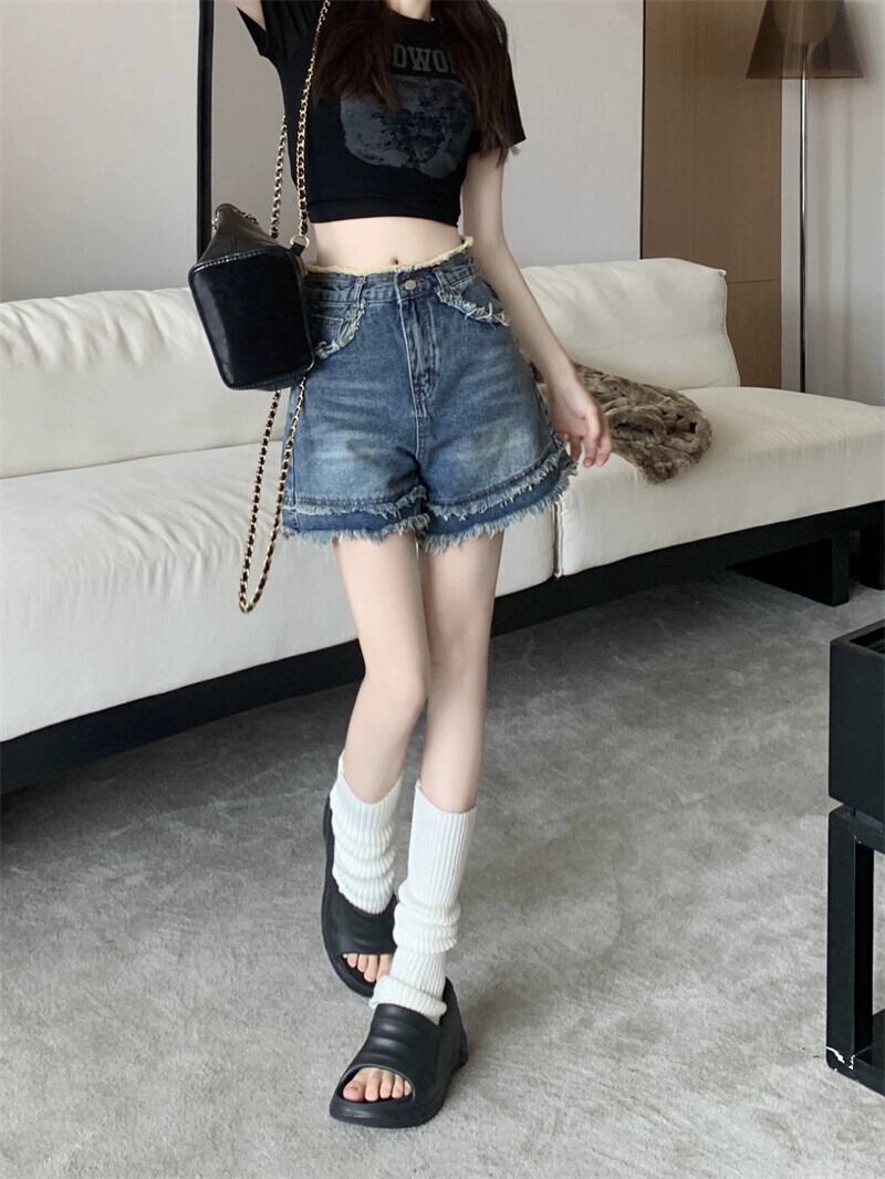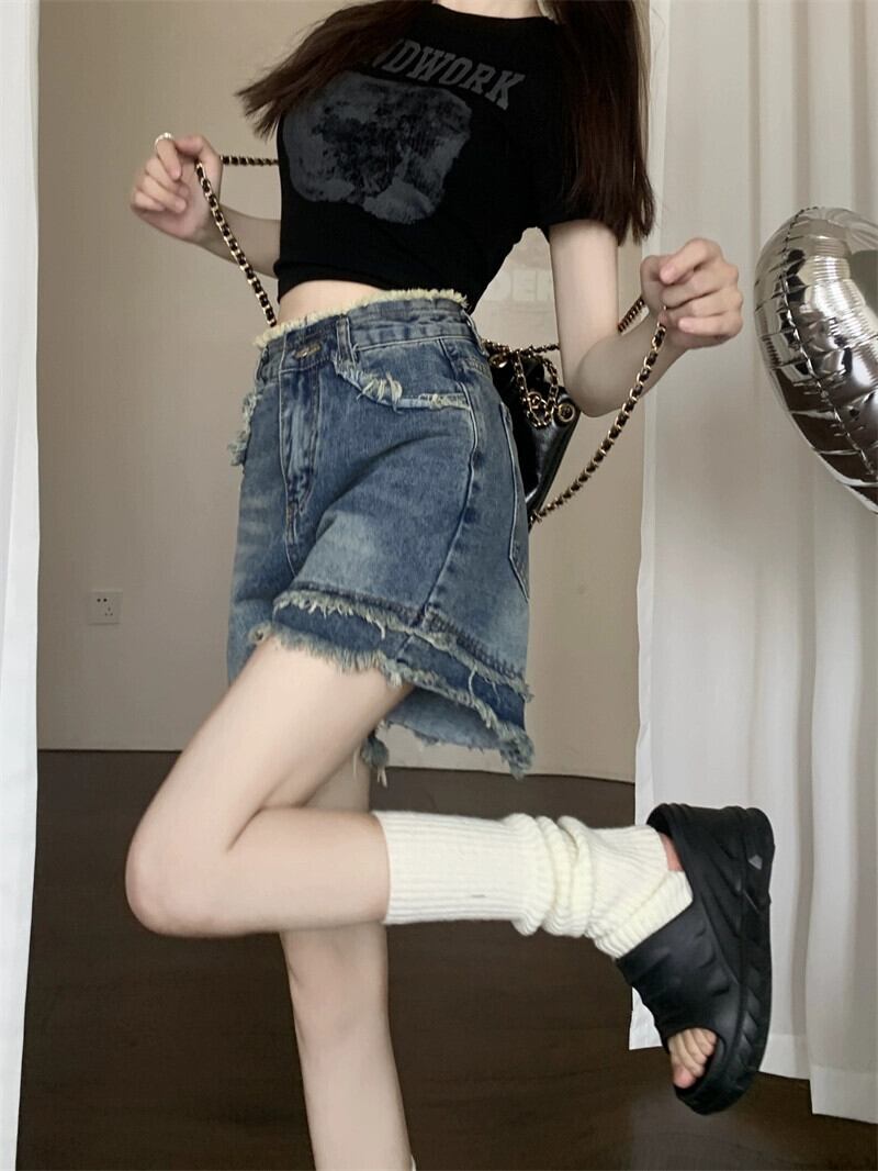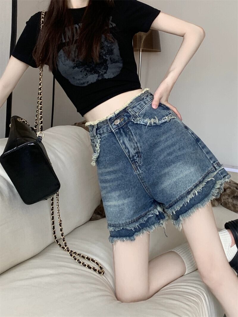 レトロローエッジデニムショートパンツレディース2023夏新作ハイウエストスリムデザインワイドレッグ一言パンツ ハイウェスト サマー 夏物 ショーツ ブルマー ワイドパンツ missk79122520752