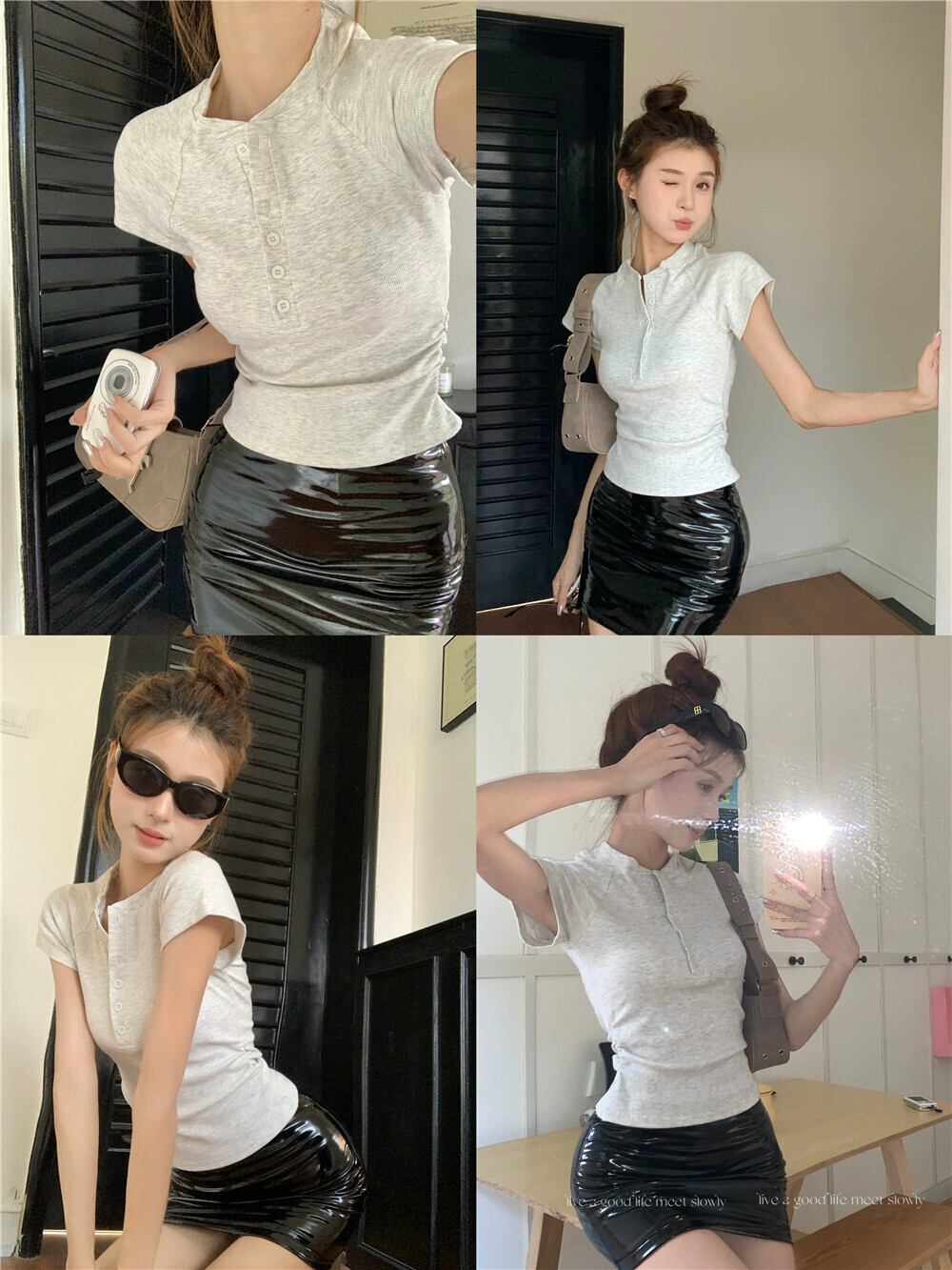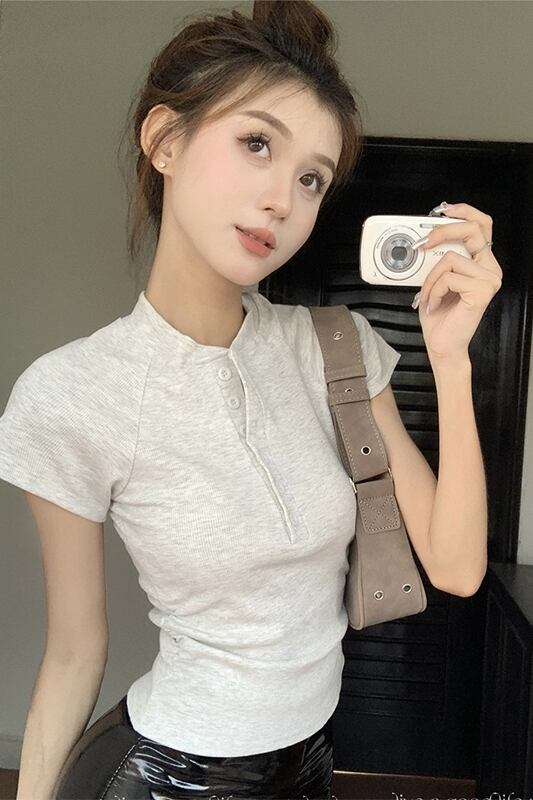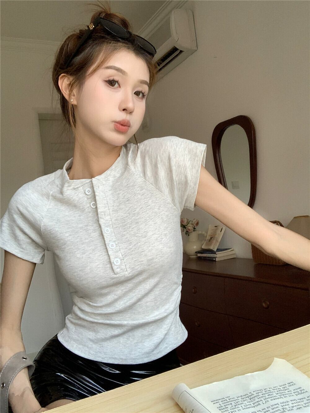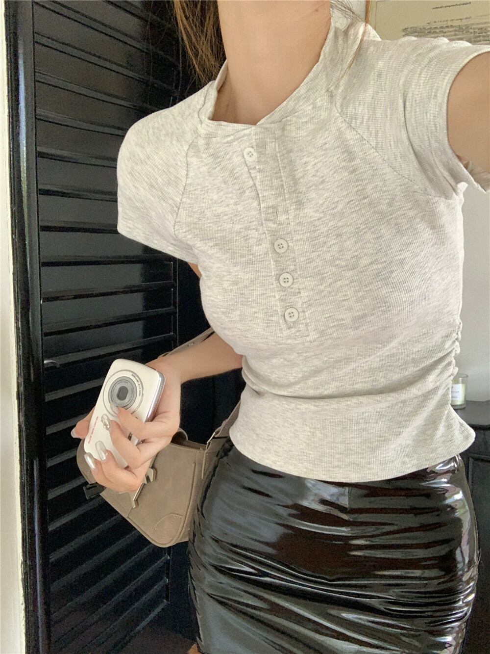 グレーのスレッド半袖 T シャツの女性の夏バージョン 2023 新しいスリムフィットと薄いデザイン感のプリーツショートトップ サマー 夏物 Tシャツ missk87042924027
