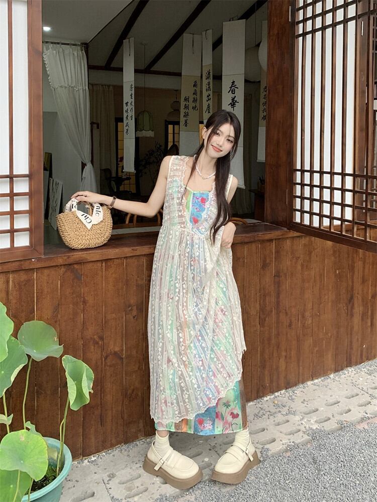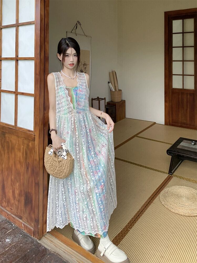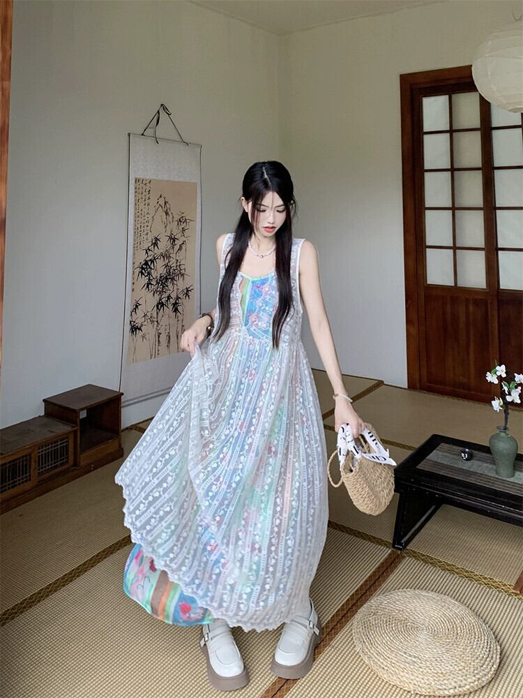 とても妖精レース刺繍ミドル丈ベストスカート花柄ステッチドレスレディース2023年新作2点セット サマー 夏物 missk6393684416