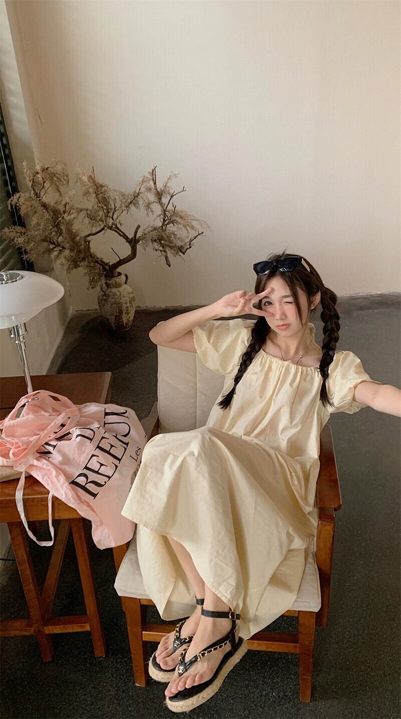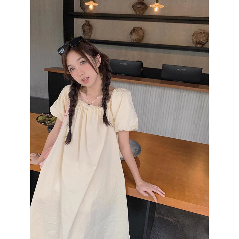 2023 夏の新スタイルのファッションスクエアカラーバックタイルーズミッドレングスソリッドカラー半袖ドレス婦人服 サマー 夏物 スクウェア missk81607715379