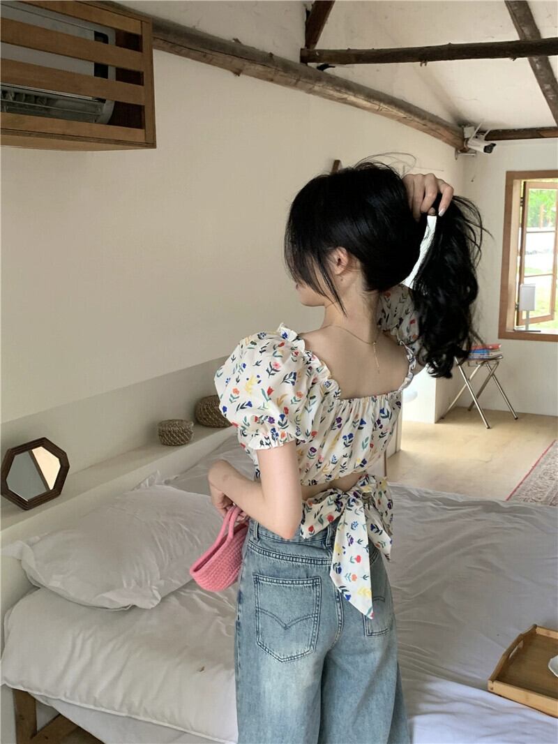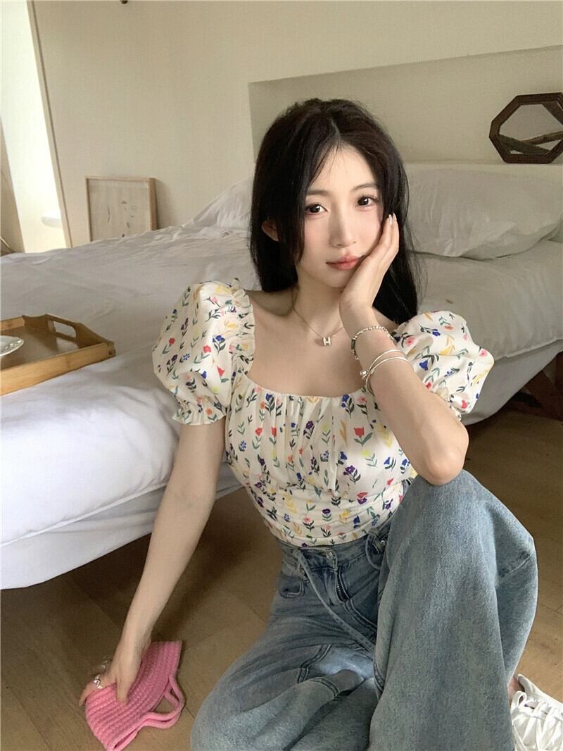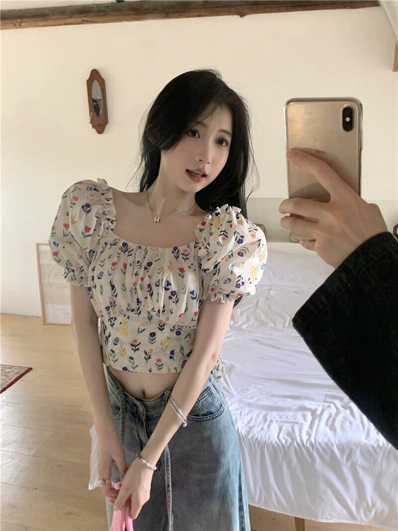 ストラップデザインの花柄シャツレディース 2023 夏の新作パフスリーブスクエアカラーフレンチウエスト半袖トップ サマー 夏物 スクウェア missk27698463575