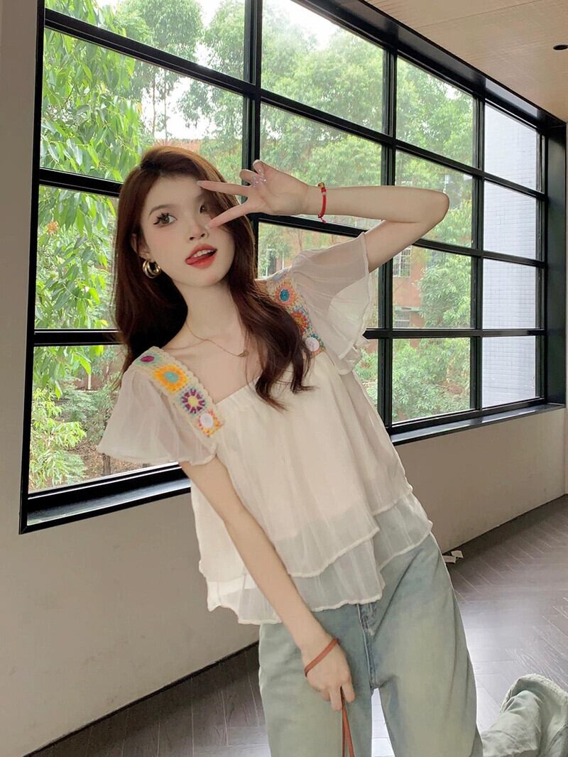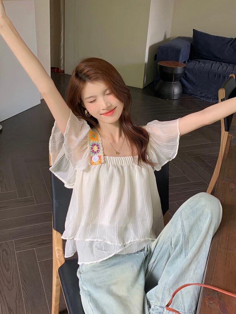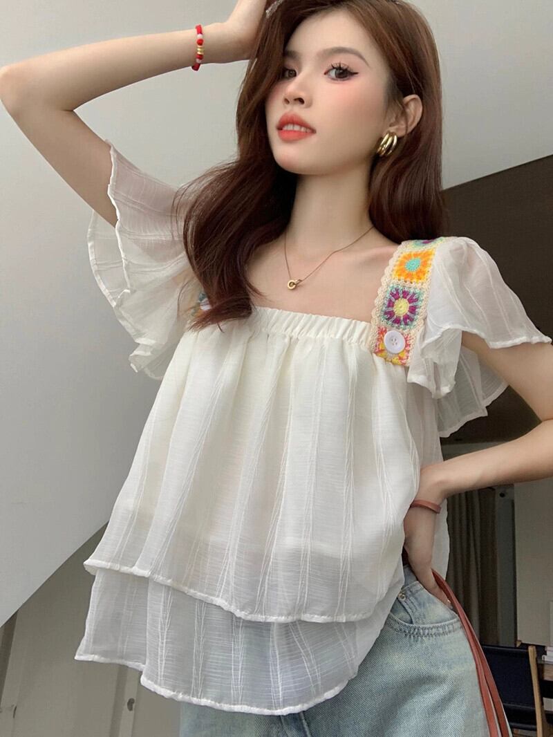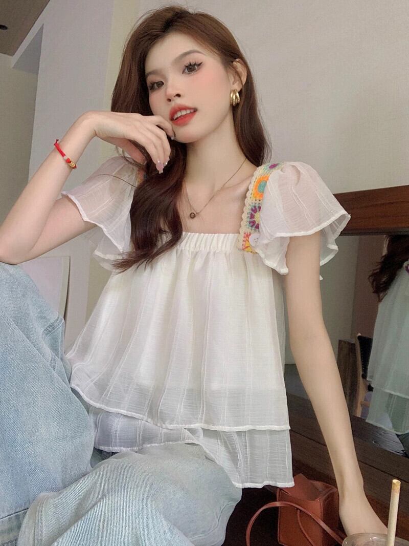 ホリデースタイルの小さなフライングスリーブシャツの女性の夏の新しいフレンチスタイルの痩身と年齢削減のスプライシング薄いシックなトップトレンド サマー 夏物 missk29105708178