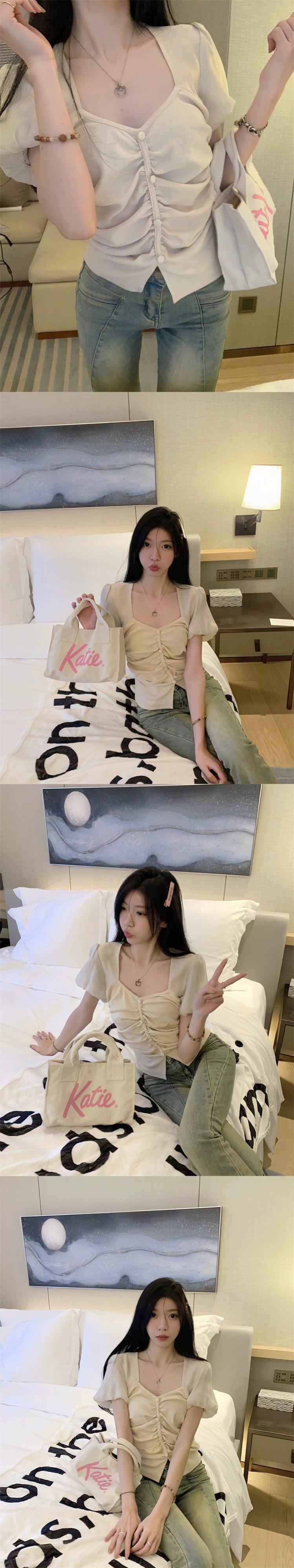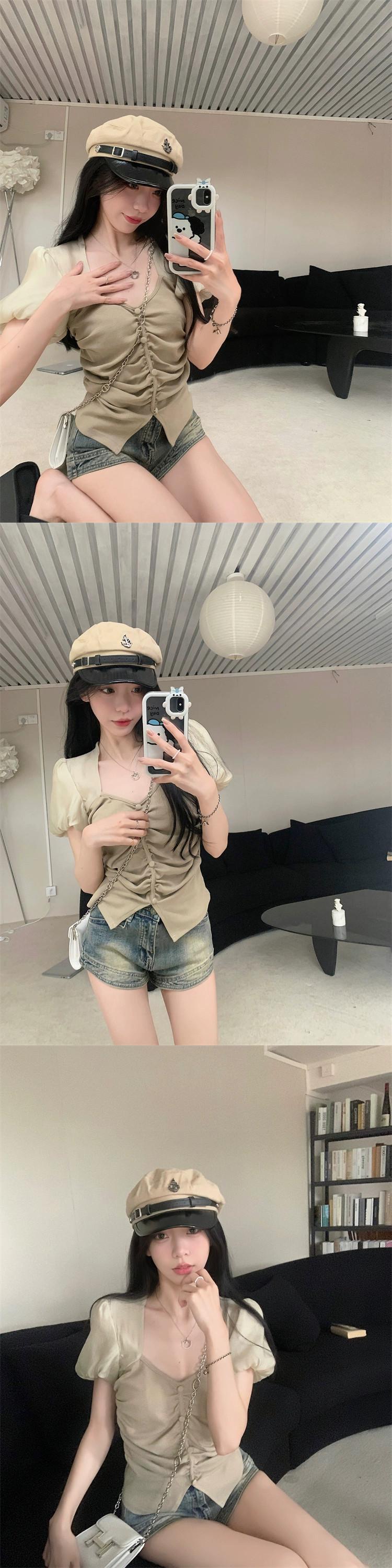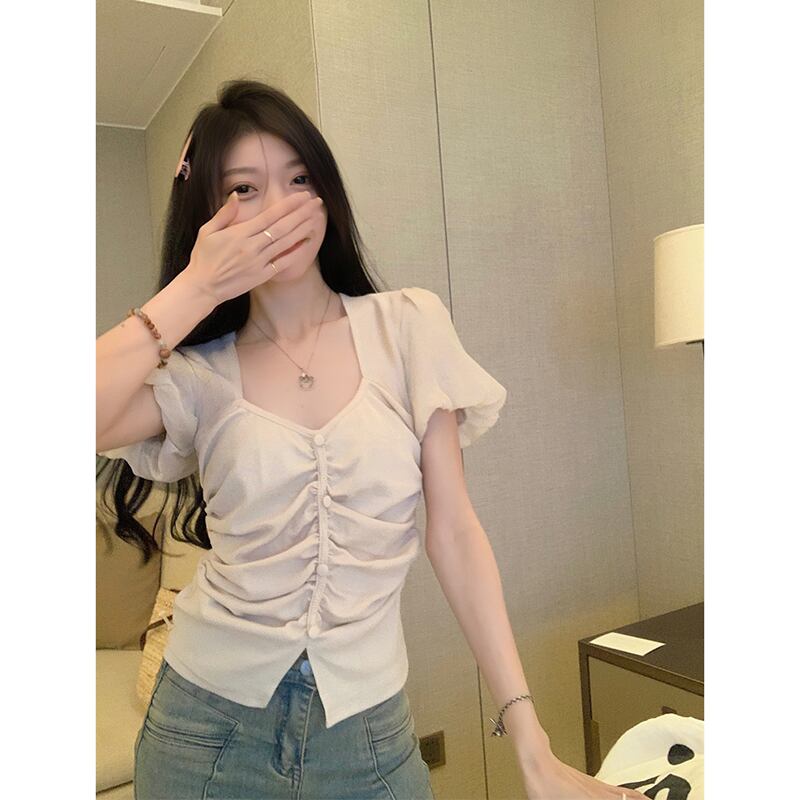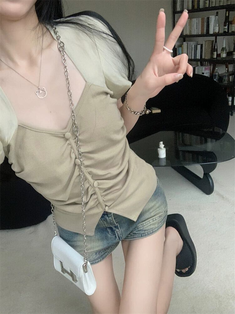 甘い気質パフスリーブ半袖 Tシャツレディース 2023 夏の新デザインセンスニッチスプライシングスクエアカラートップ 大人ガーリー スウィート キュート カジュアル サマー 夏物 スクウェア missk91936102568