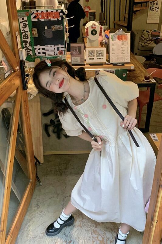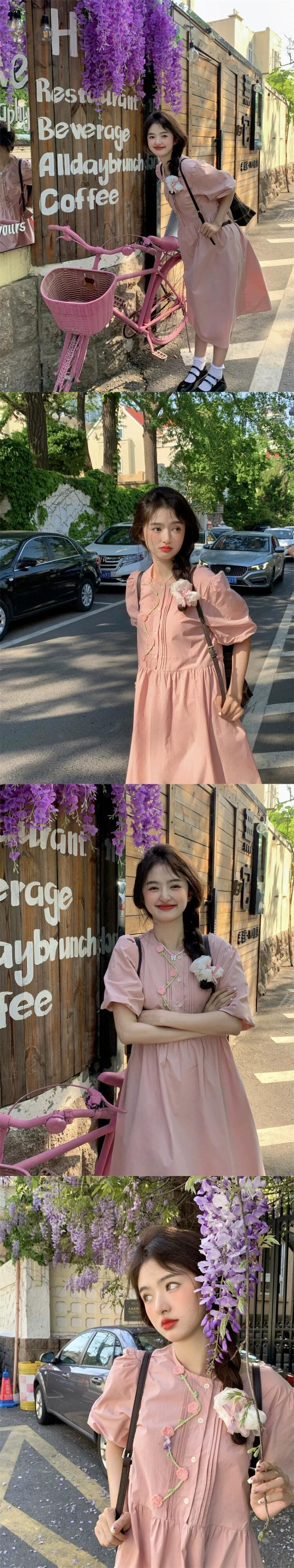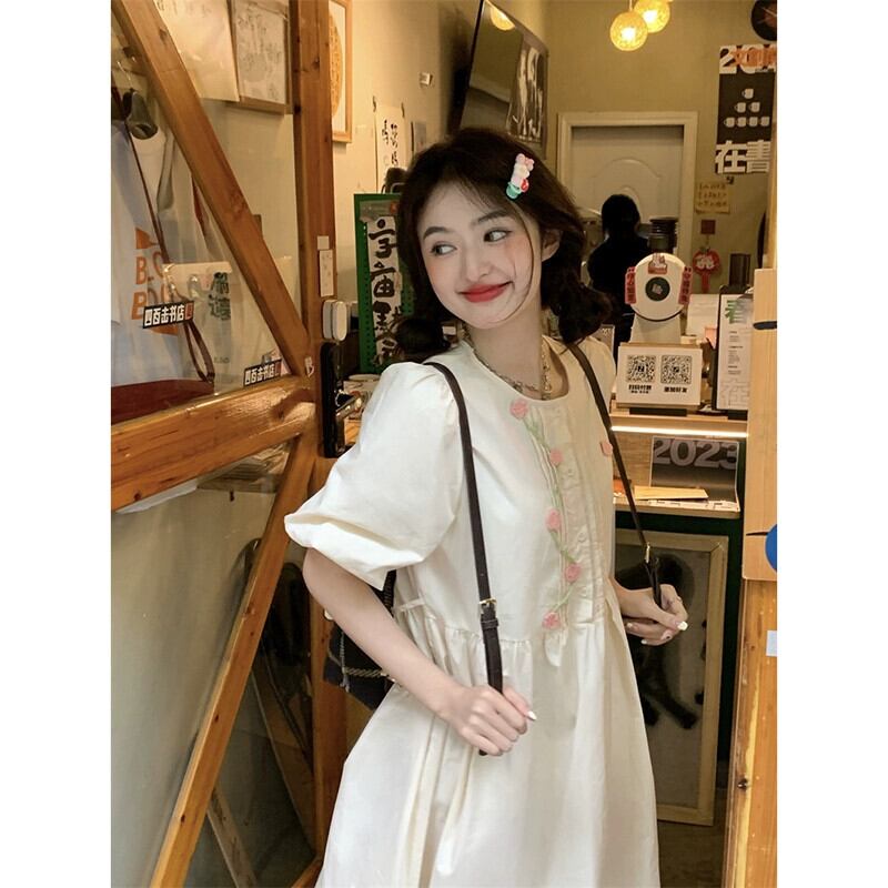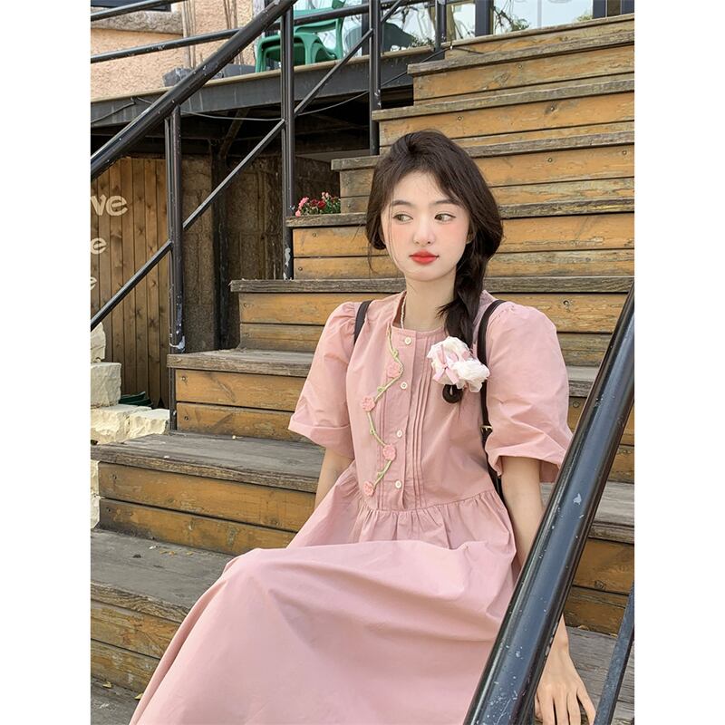 甘い重い立体フラワードレス女性の夏の 2023 新しいパフスリーブハイウエストスリムミドル丈スカート ハイウェスト 大人ガーリー スウィート キュート カジュアル サマー 夏物 フラワーデザイン missk72027689965