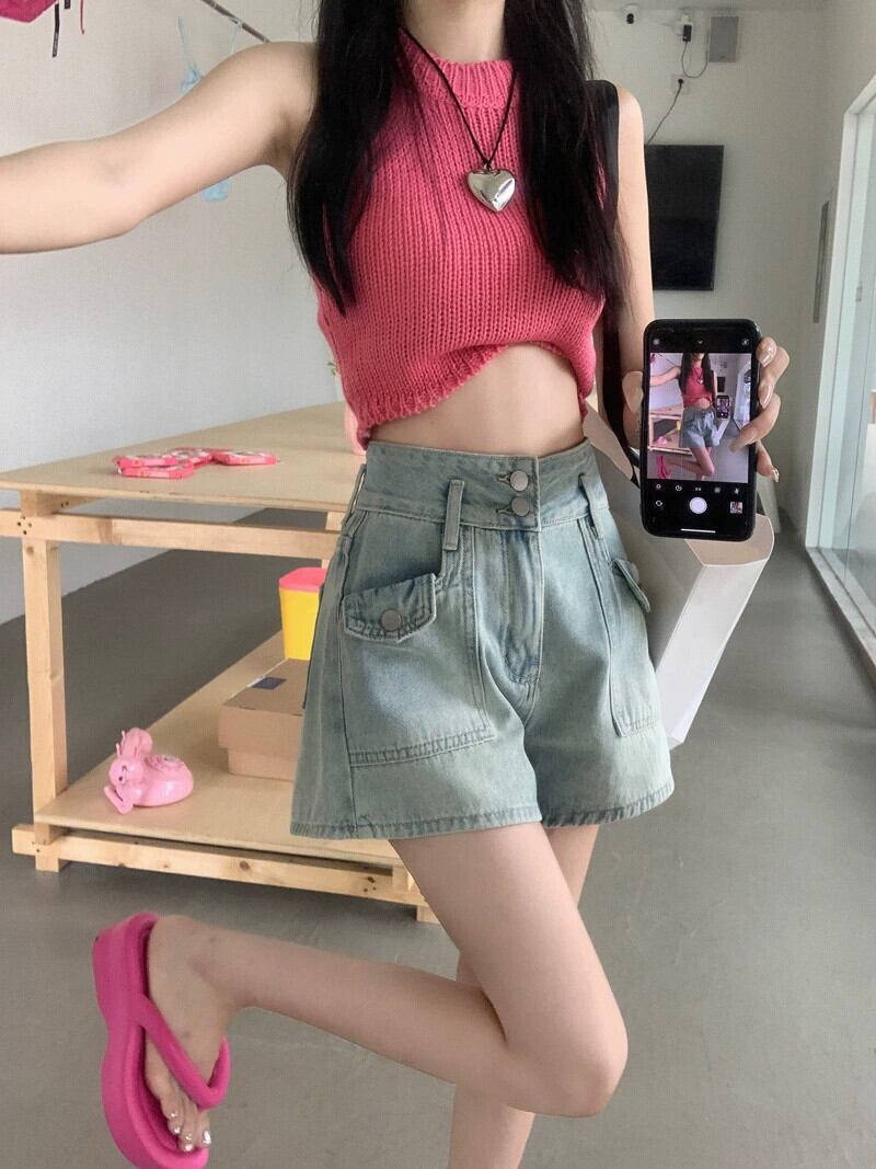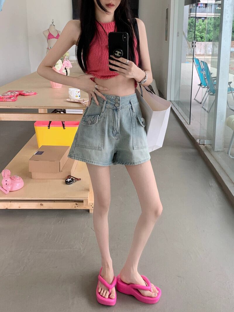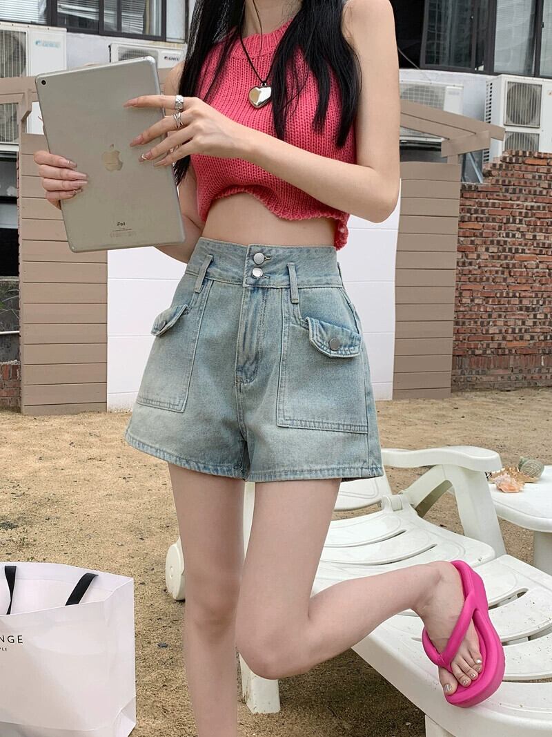 ウォッシュドワイドレッグデニムショートパンツレディース夏新作ハイウエストスリムレトロデザインセンスポケットオールマッチAラインパンツ ハイウェスト サマー 夏物 ショーツ ブルマー missk25334575160