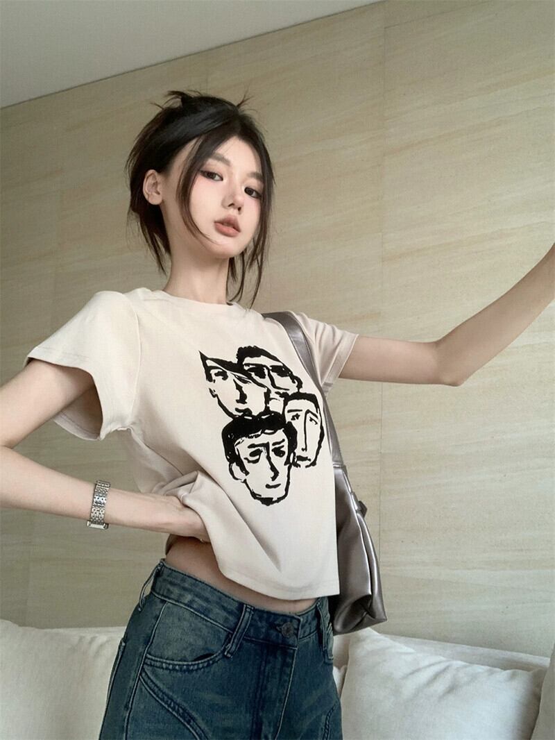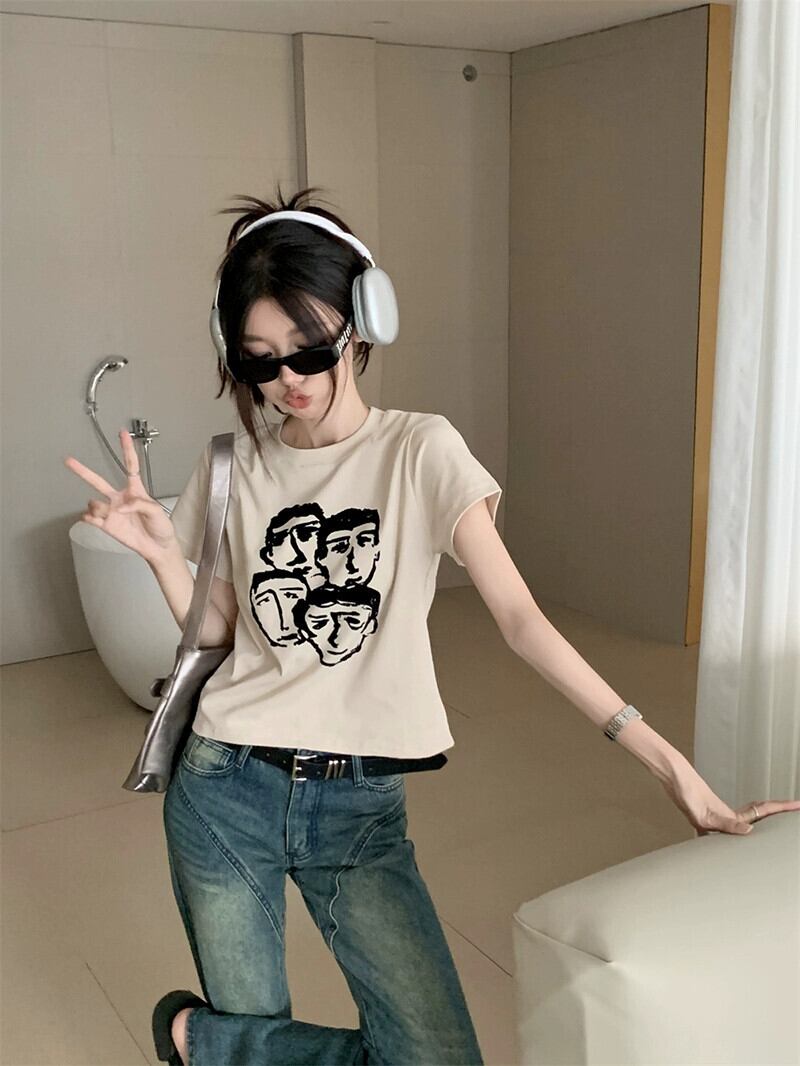 アメリカンレトロニット半袖Tシャツレディース2023年夏新作プリントショートセクションネットレッドオールマッチショルダートップ サマー 夏物 missk43767546332