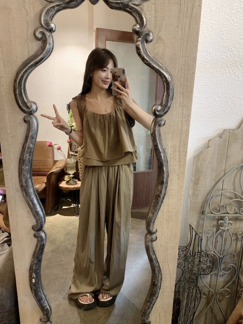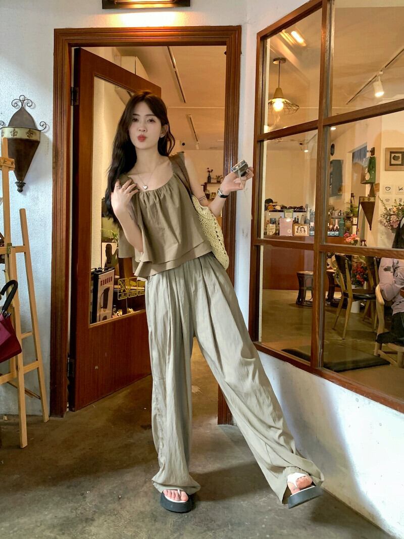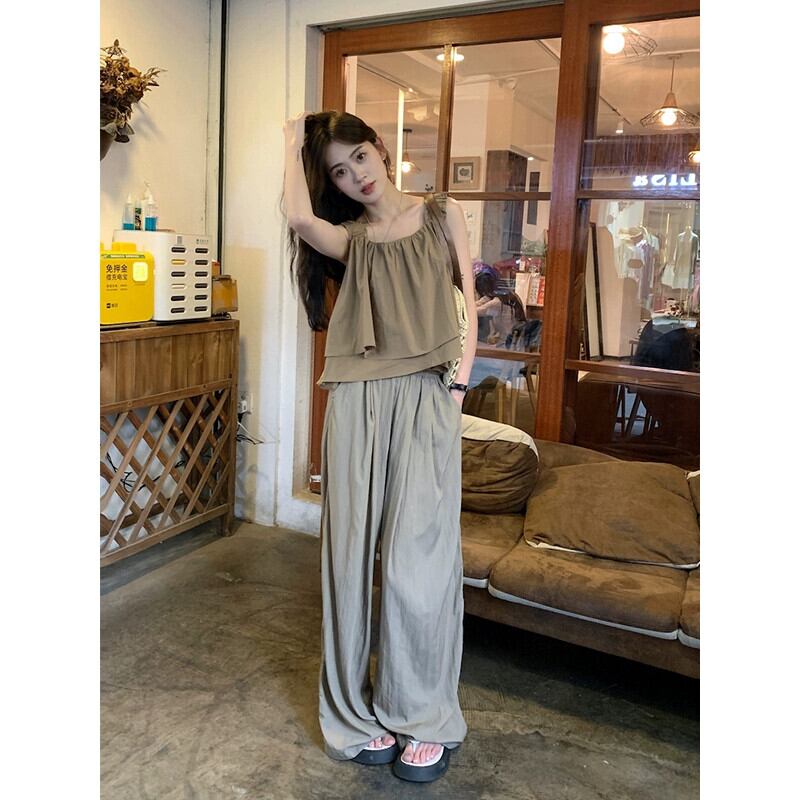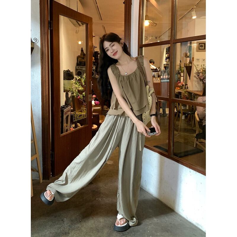 フリル薄型サスペンダー小さなシャツハイウエストワイドレッグパンツ女性の夏の 2023 新しい甘じょっぱいファッションスーツ ハイウェスト 大人ガーリー スウィート キュート カジュアル サマー 夏物 missk61027210995