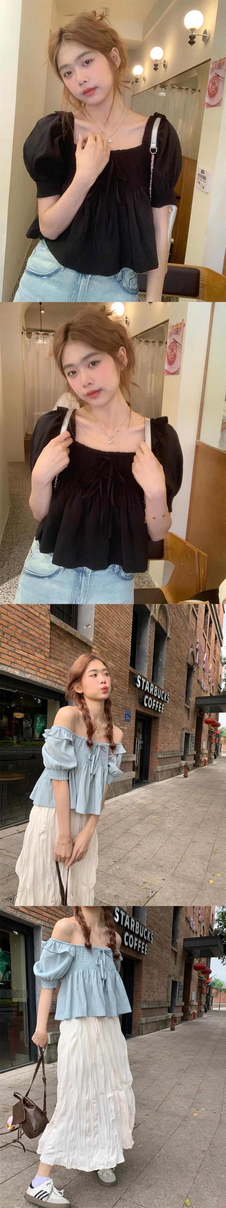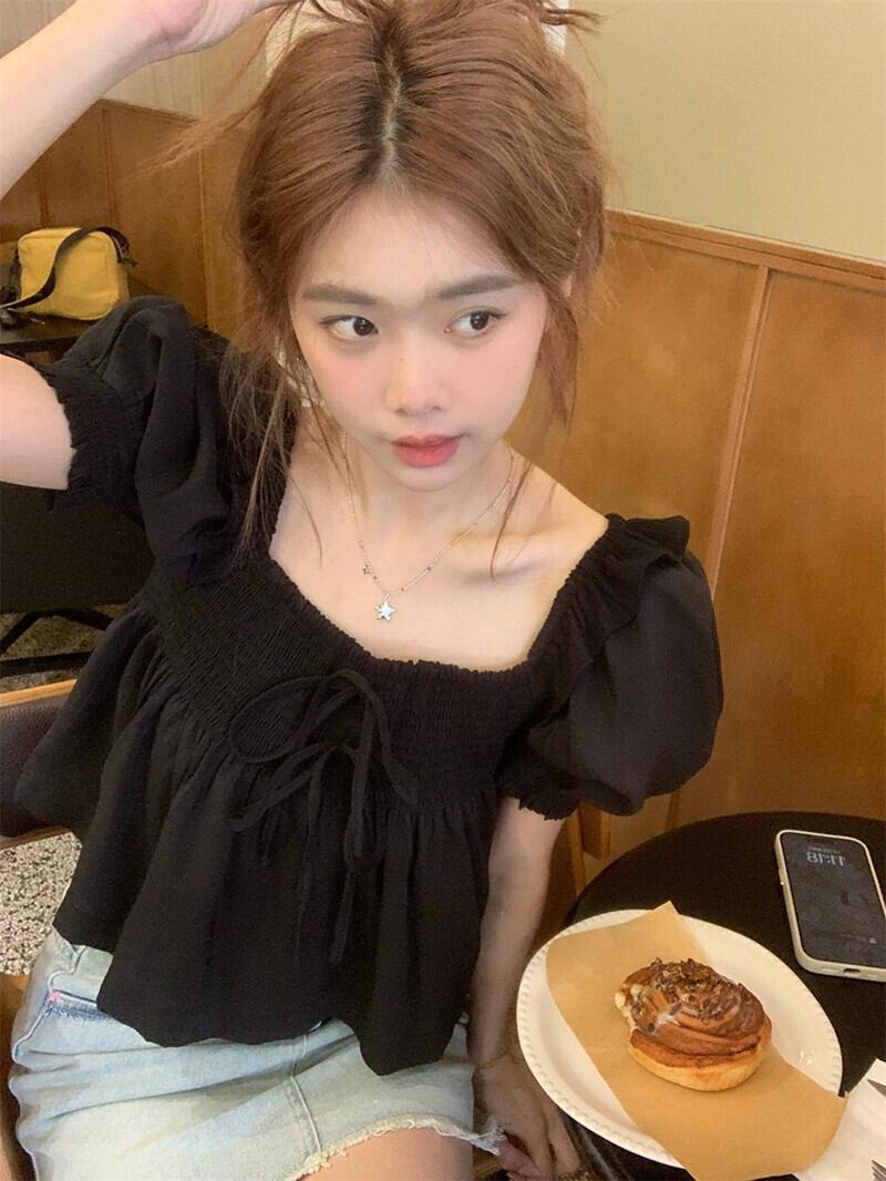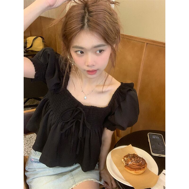スクエアカラーツーウェアショートパフスリーブシャツレディース夏新作甘いクール折りデザイン半袖ブラックトップ潮 大人ガーリー スウィート キュート カジュアル サマー 夏物 スクウェア missk30089473913