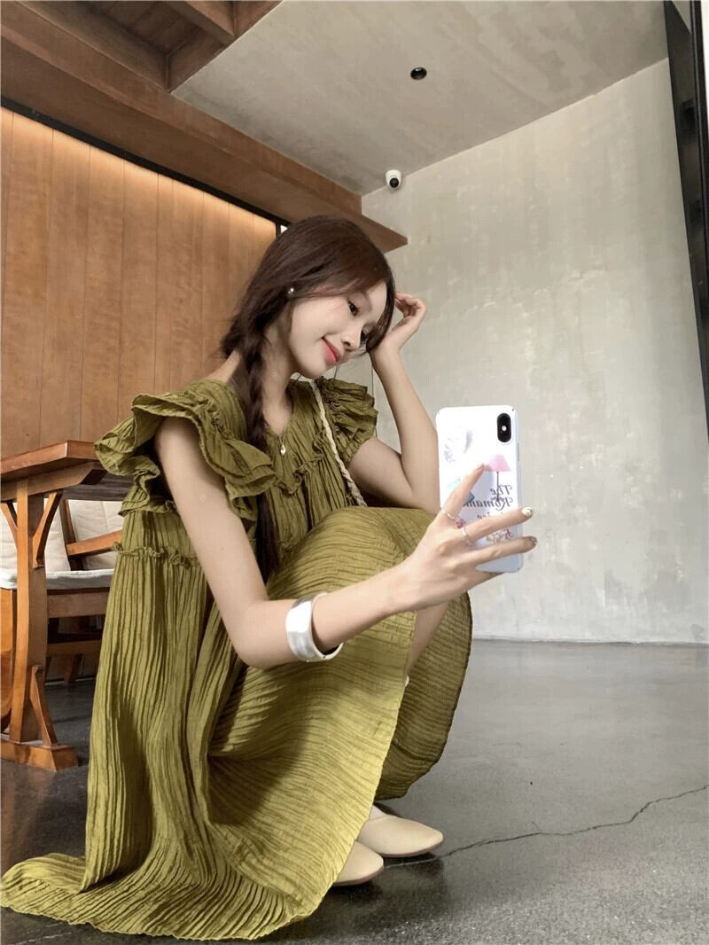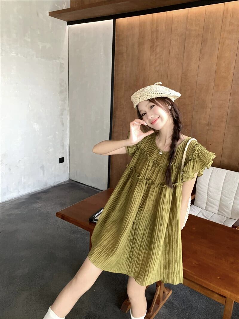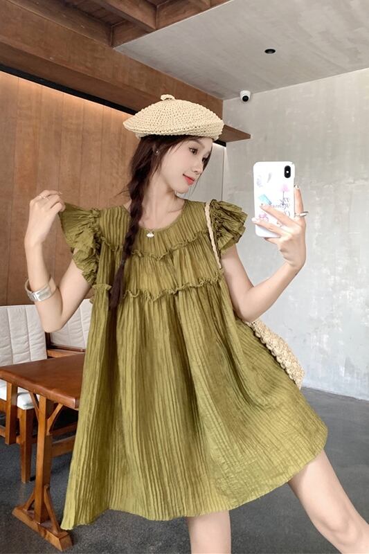 小さなフライングスリーブドレスの女性の夏の 2023 新しいフレンチラウンドネックプリーツデザイン木耳サイドルーズドールスカート サマー 夏物 Oネック missk28836063100