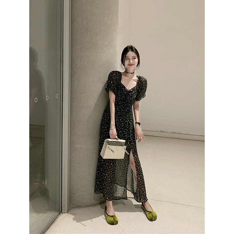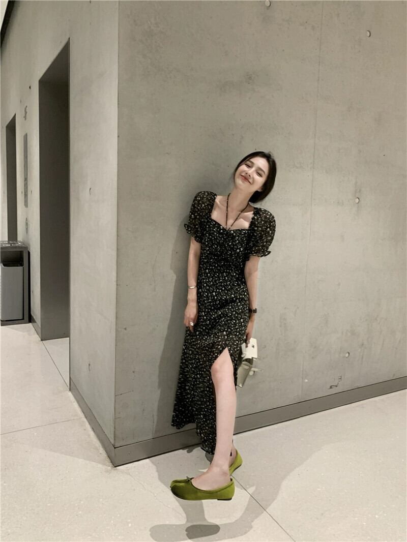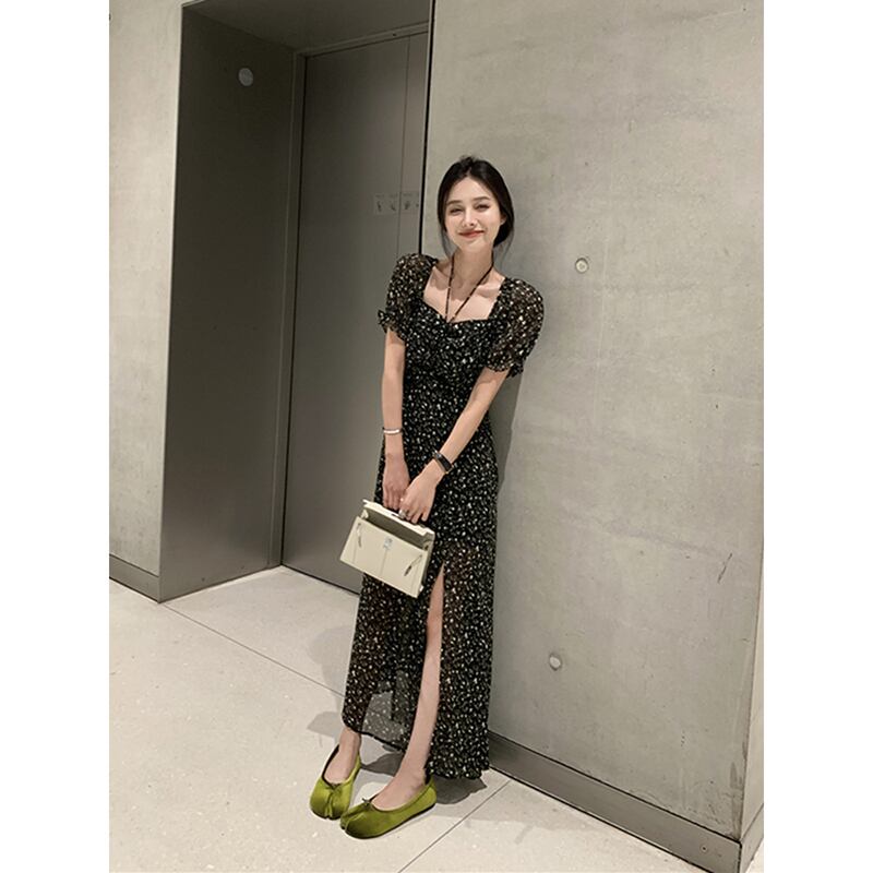 レトロ花柄スクエアネックパフスリーブドレスの女性の夏 2023 スリムウエストスリットヘップバーンスタイルドレス サマー 夏物 スクウェア missk91169754531