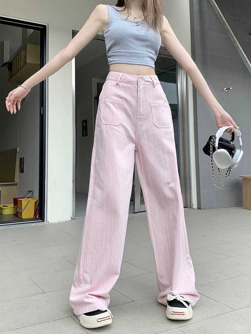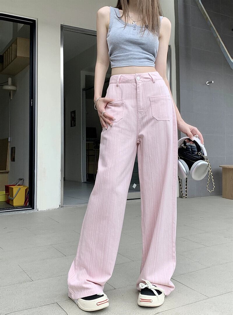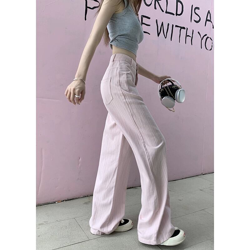 ドレープピンクワイドレッグジーンズレディース夏新レトロハイウエストスリムデザインストライプストレートパンツ ハイウェスト サマー 夏物 missk95931707610