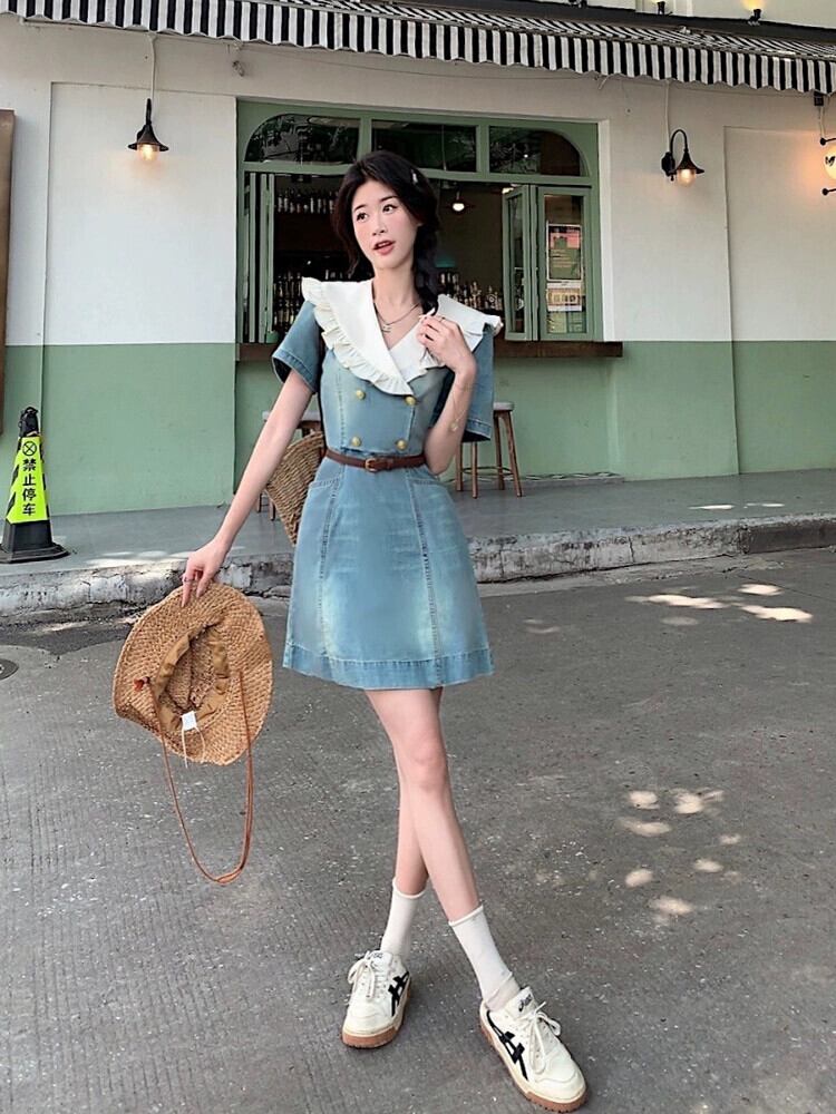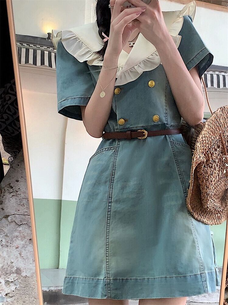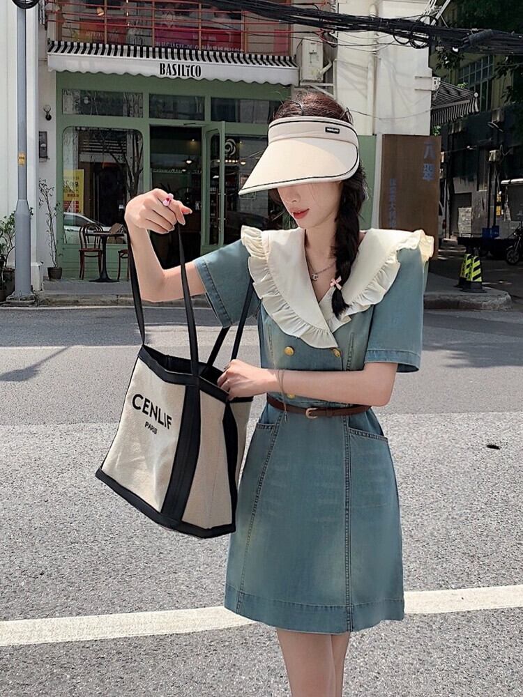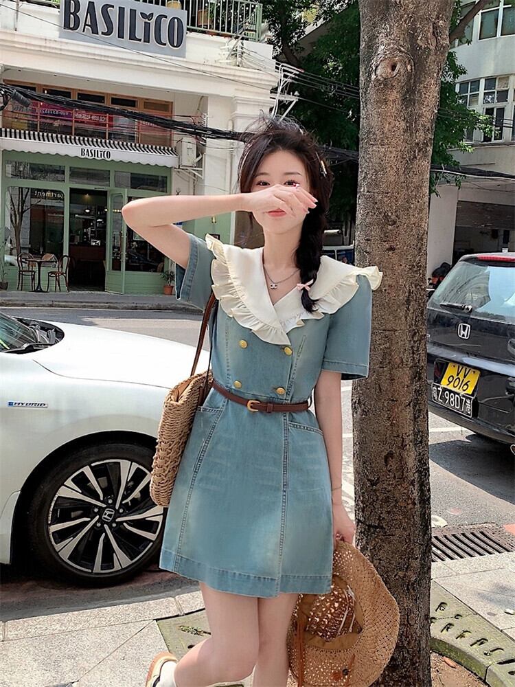 デニムドレスの女性の 2023 夏の新しいフレンチスタイルのニッチデザインのフリルダブルブレスト気質 A ラインスカート サマー 夏物 Aライン missk66534447944