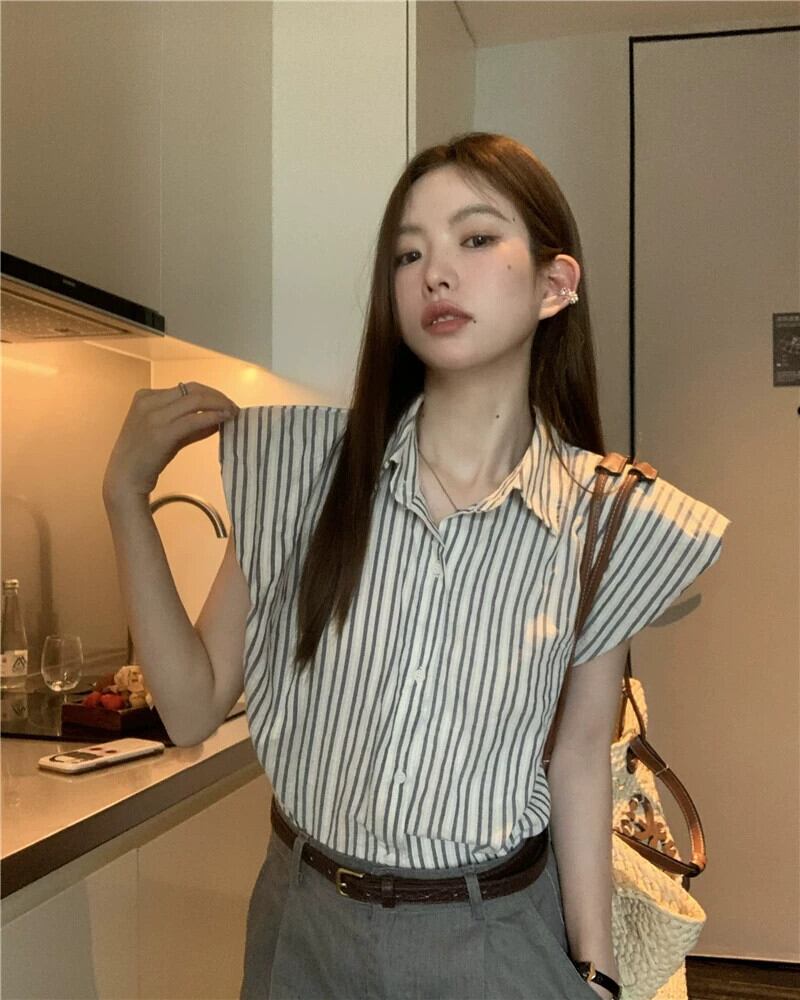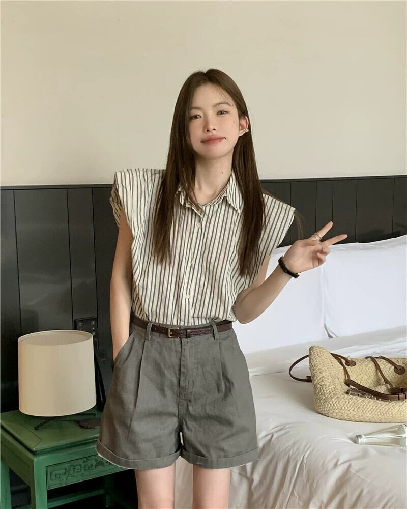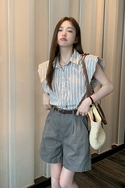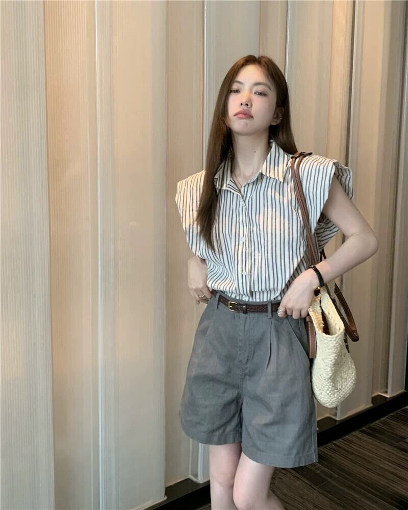 センスロールエッジストライプノースリーブシャツハイウエストワイドレッグデニムショートパンツ女性の夏の 2023 新しいファッションスーツ ハイウェスト サマー 夏物 ショーツ ブルマー ワイドパンツ missk37924583857