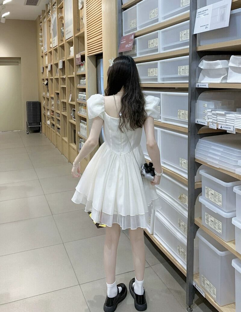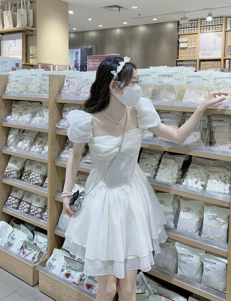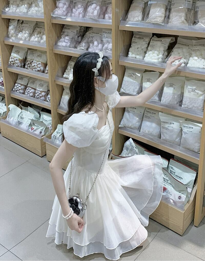 風ドレスの女性の夏の 2023 新しいスクエアカラーパフスリーブウエストスリムスーパーフェアリー半袖 A ラインスカート サマー 夏物 Aライン スクウェア missk62577714384