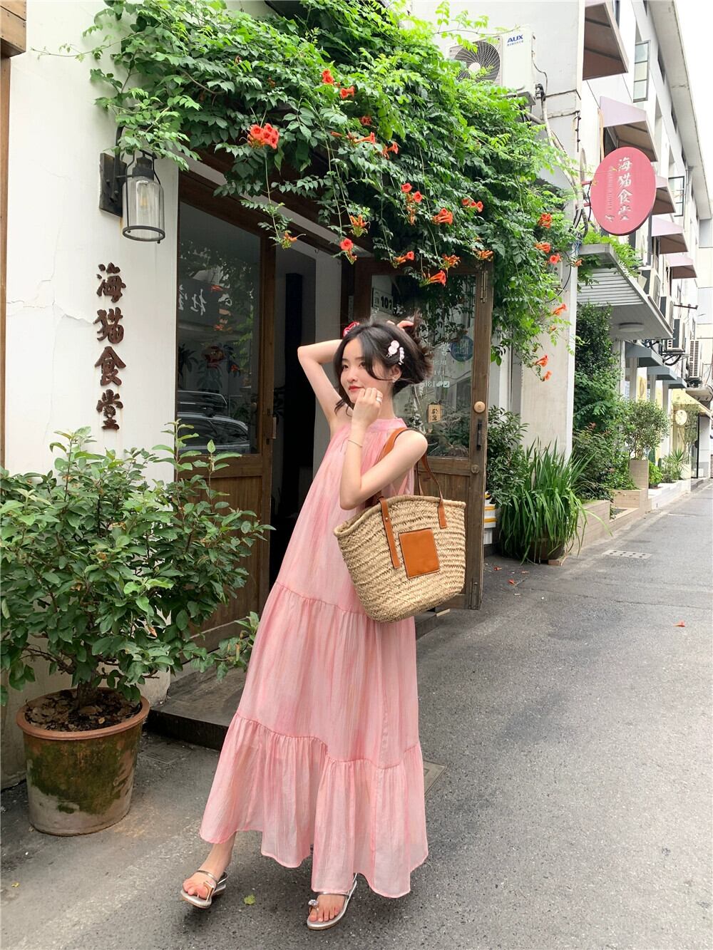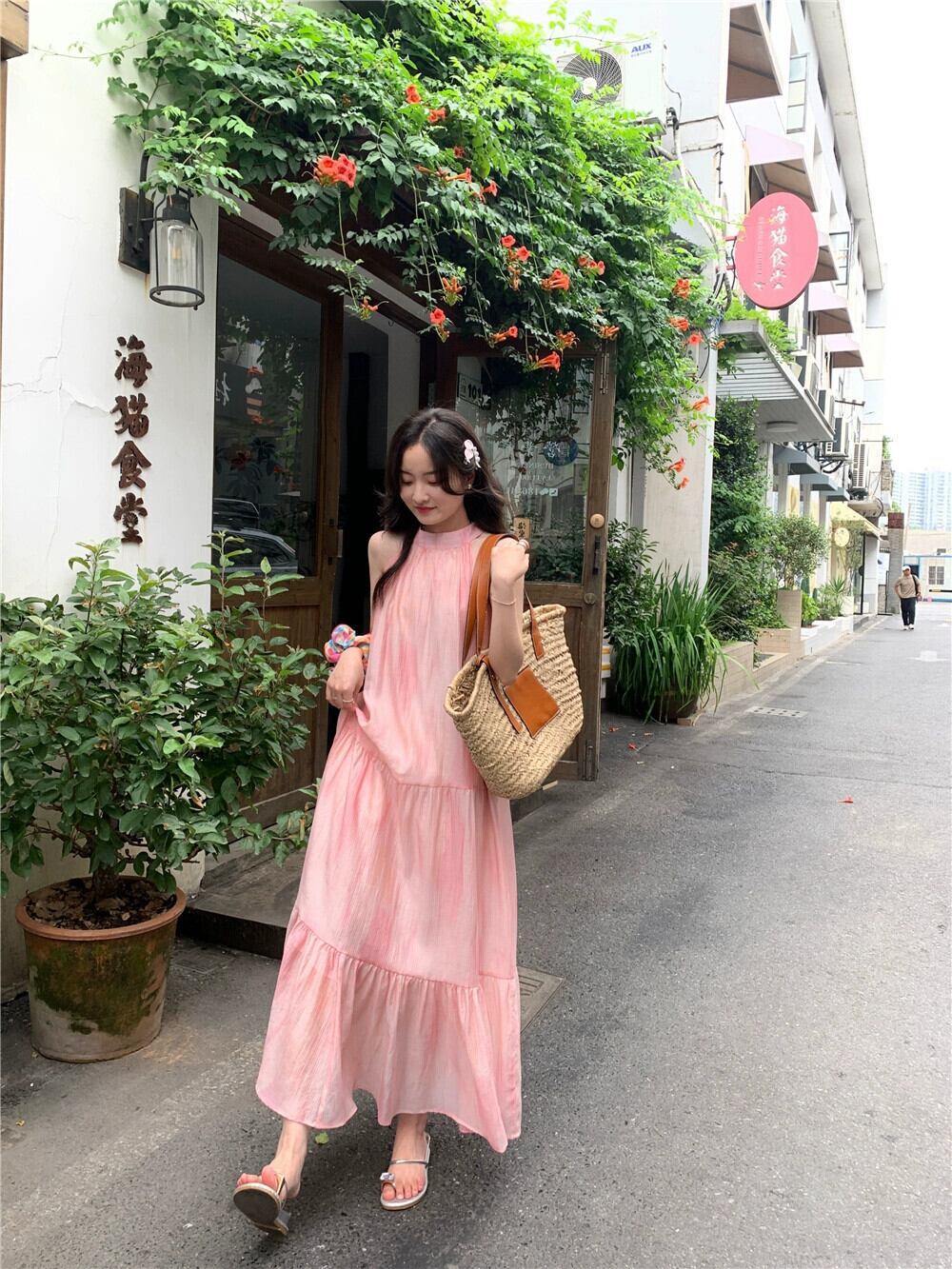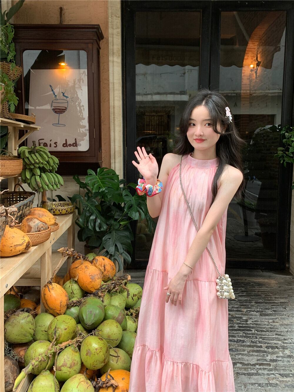 甘い膝丈ノースリーブホルターネックドレス女性の夏のフランスの新しい緩いファッションデザインピンクのロングスカート 大人ガーリー スウィート キュート カジュアル サマー 夏物 missk58830494769