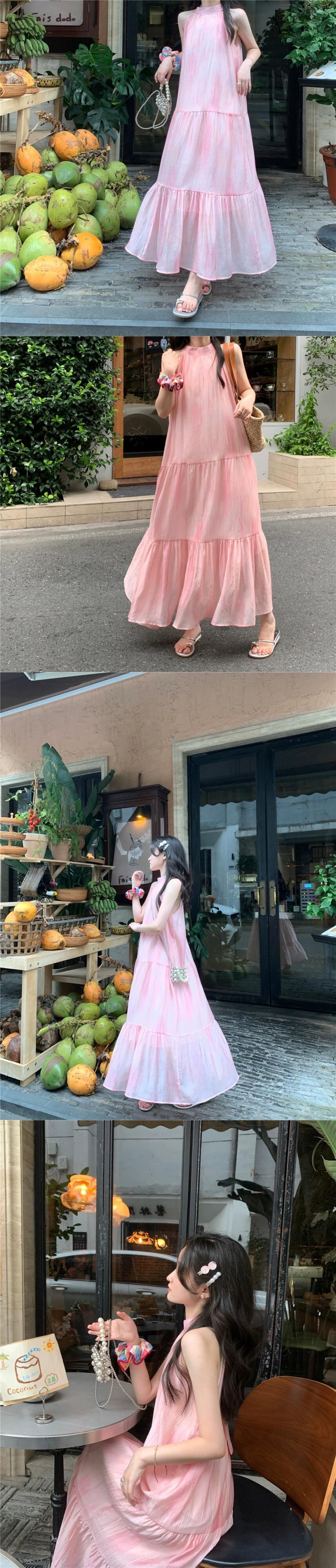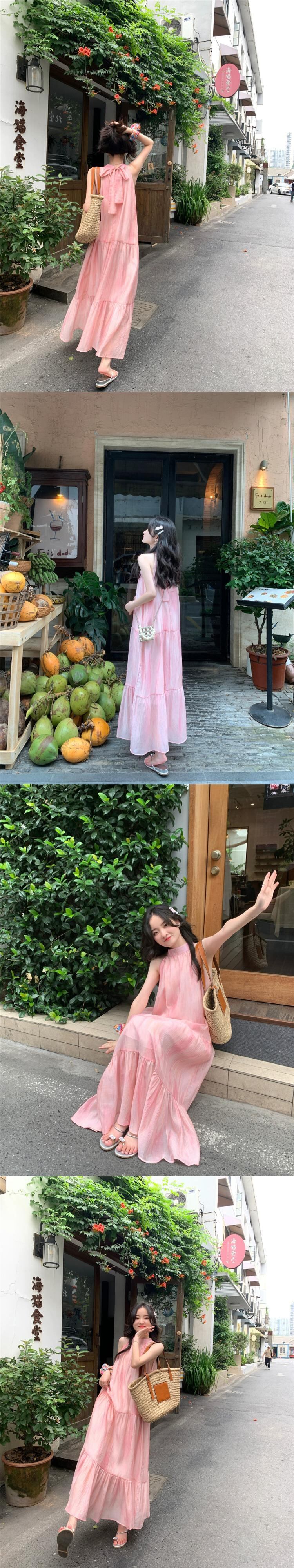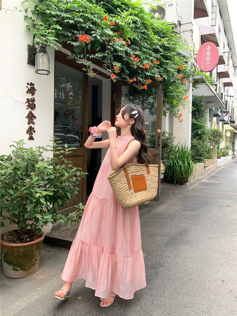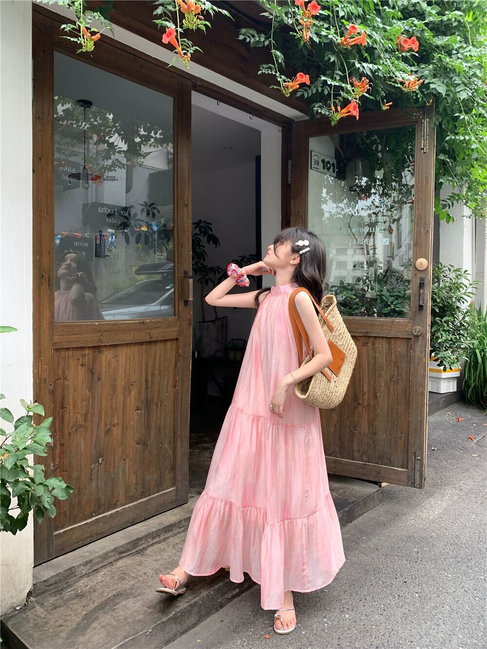 甘い膝丈ノースリーブホルターネックドレス女性の夏のフランスの新しい緩いファッションデザインピンクのロングスカート 大人ガーリー スウィート キュート カジュアル サマー 夏物 missk58830494769