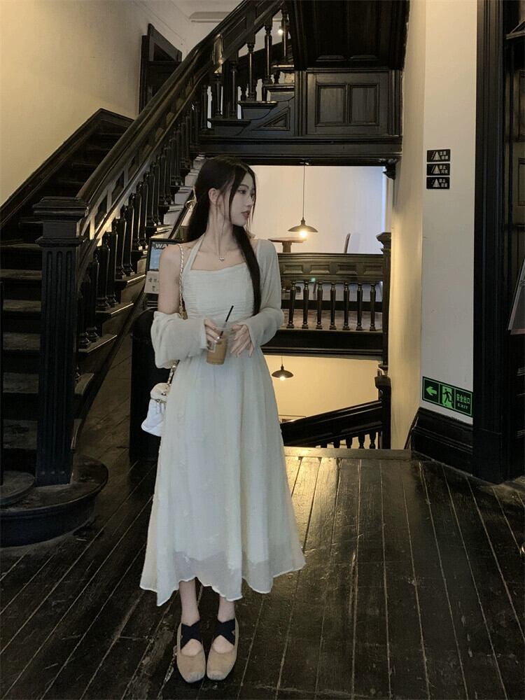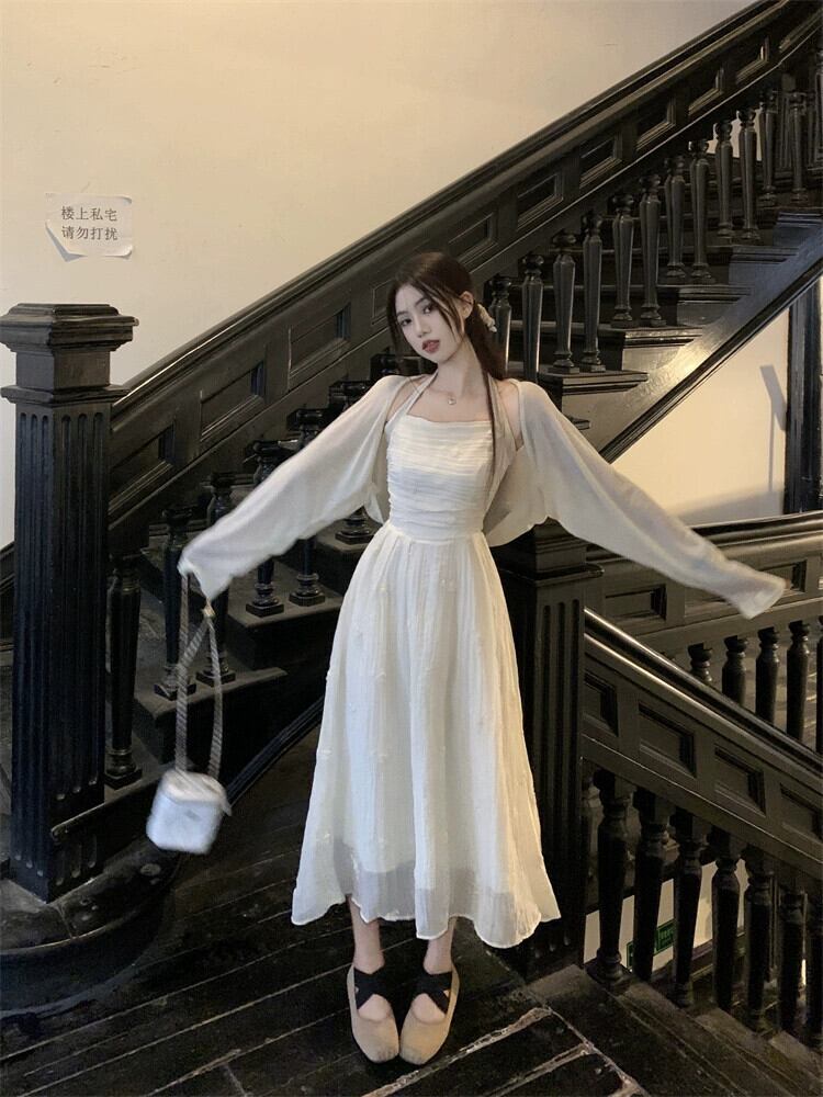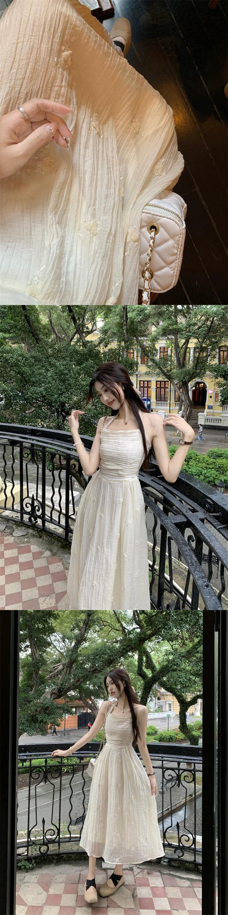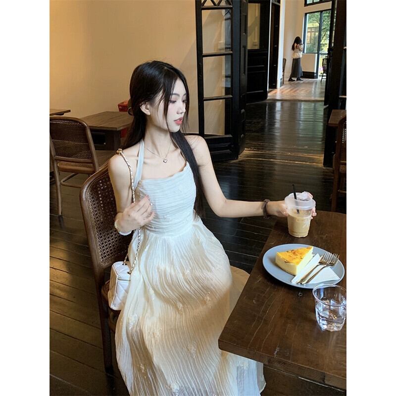 刺繍ハンギングネックストラップドレス女性の夏の 2023 新しい優しいスタイルプリーツウエスト痩身ミッドレングススカート レッド サマー 夏物 missk87587463585