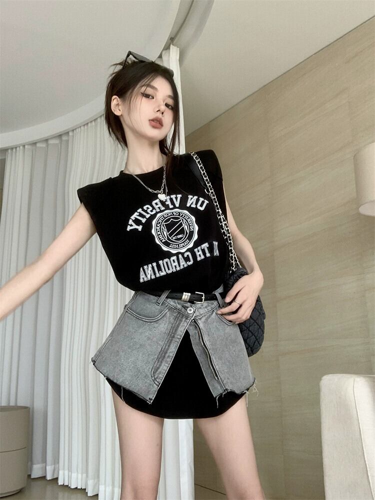 ホットなデザインセンスミッドレングスノースリーブベスト Tシャツデニムガードルショートスカート女性の夏の 2023 新しい 2 点セット サマー 夏物 missk44379204085