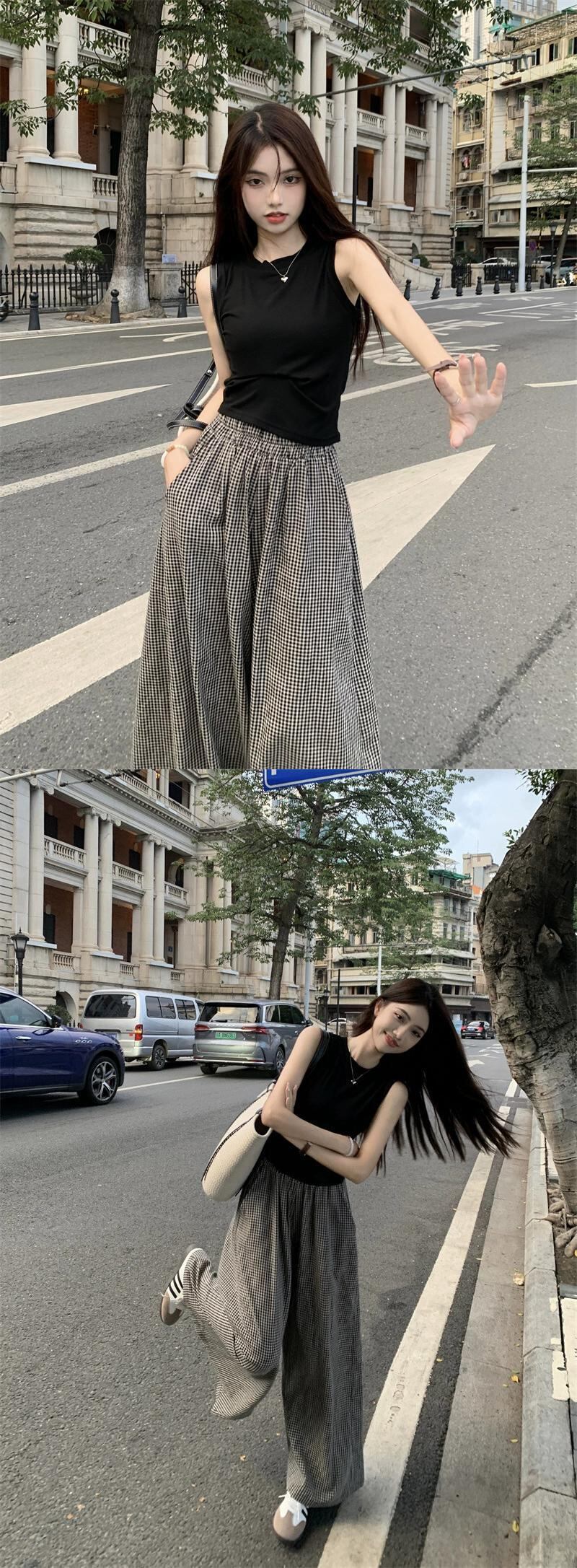 -ウエストチェック柄カジュアルパンツレディース袴夏バージョン2023新作着痩せデザインセンスワイドモップパンツ サマー 夏物 missk14823708099