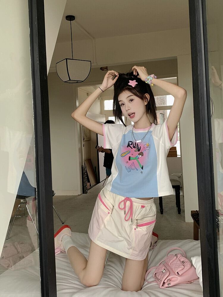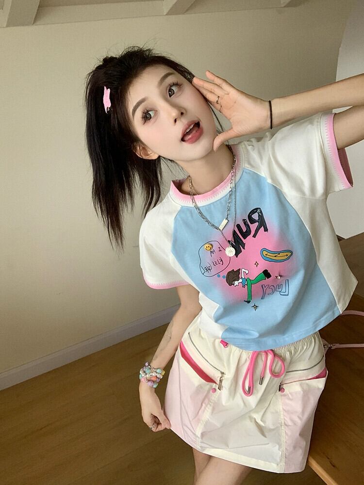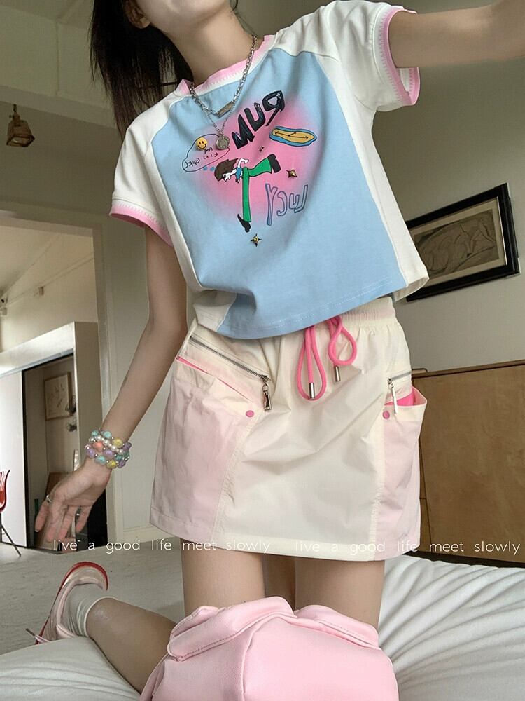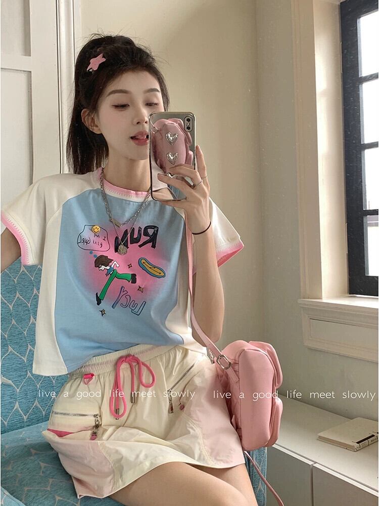 ドーパミン着用漫画プリント半袖 Tシャツツーリングショートスカート夏 2023 新しいファッションスーツトレンド サマー 夏物 missk91093398928