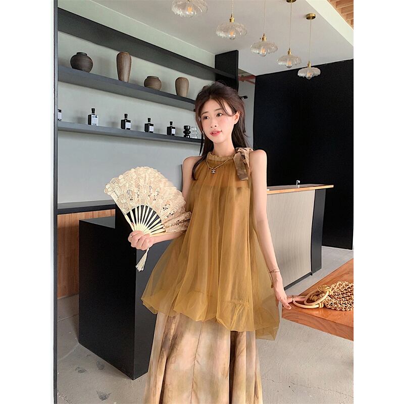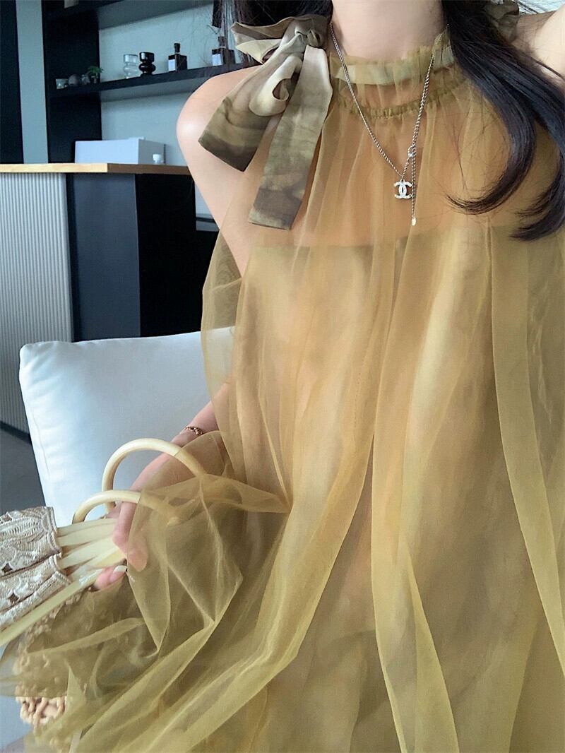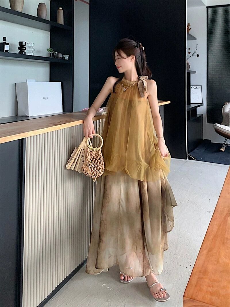 気質吊りネックサスペンダードレス夏バージョン 2023 新しいメッシュスプライシング偽ツーピースミッドレングス妖精スカート サマー 夏物 missk64989349976