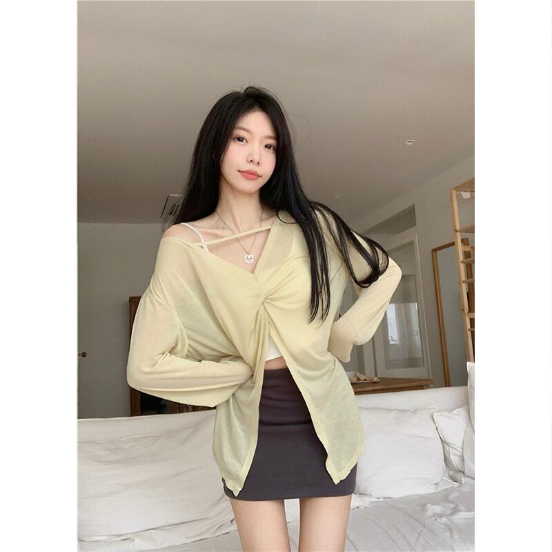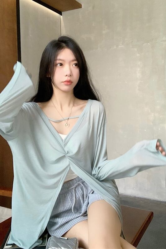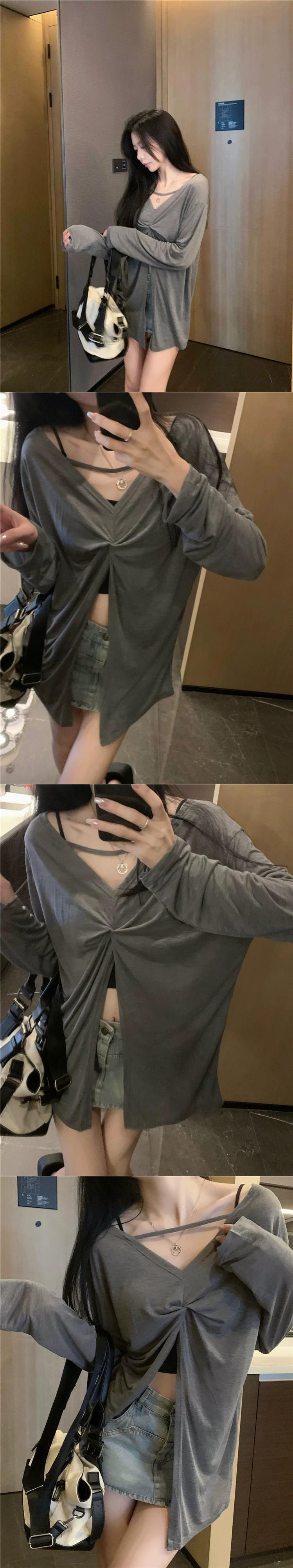 レイジースタイル薄い日焼け止めTシャツレディース夏バージョン2023新しい前後二着Vネックデザインセンス長袖トップ ロング サマー 夏物 missk904061816