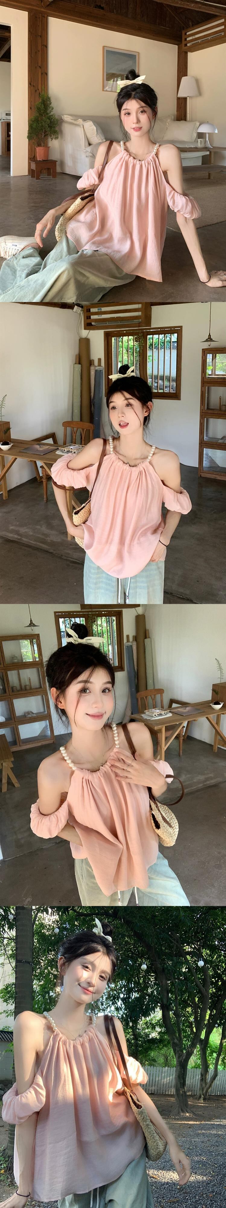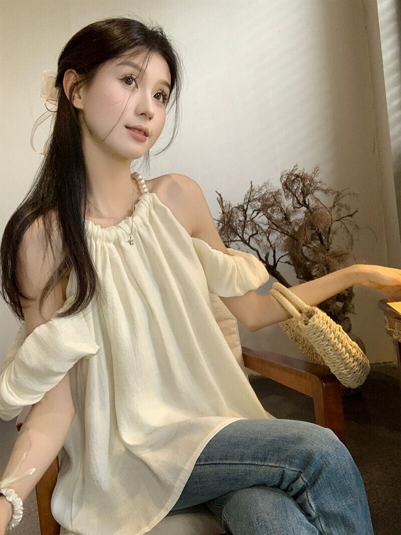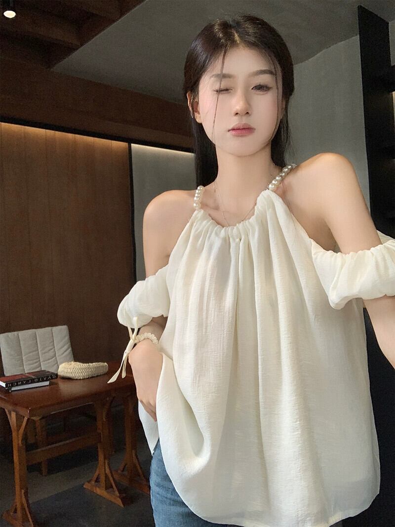 優しいスタイルのパール吊りネックストラップシャツ女性の夏の 2023 新しいランタンスリーブストラップレスルーズ半袖トップ サマー 夏物 真珠 missk8657065150
