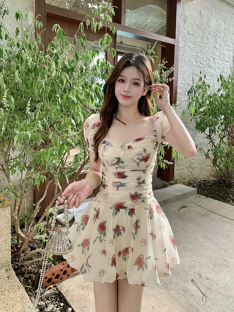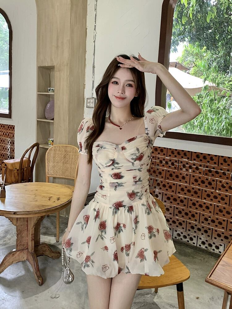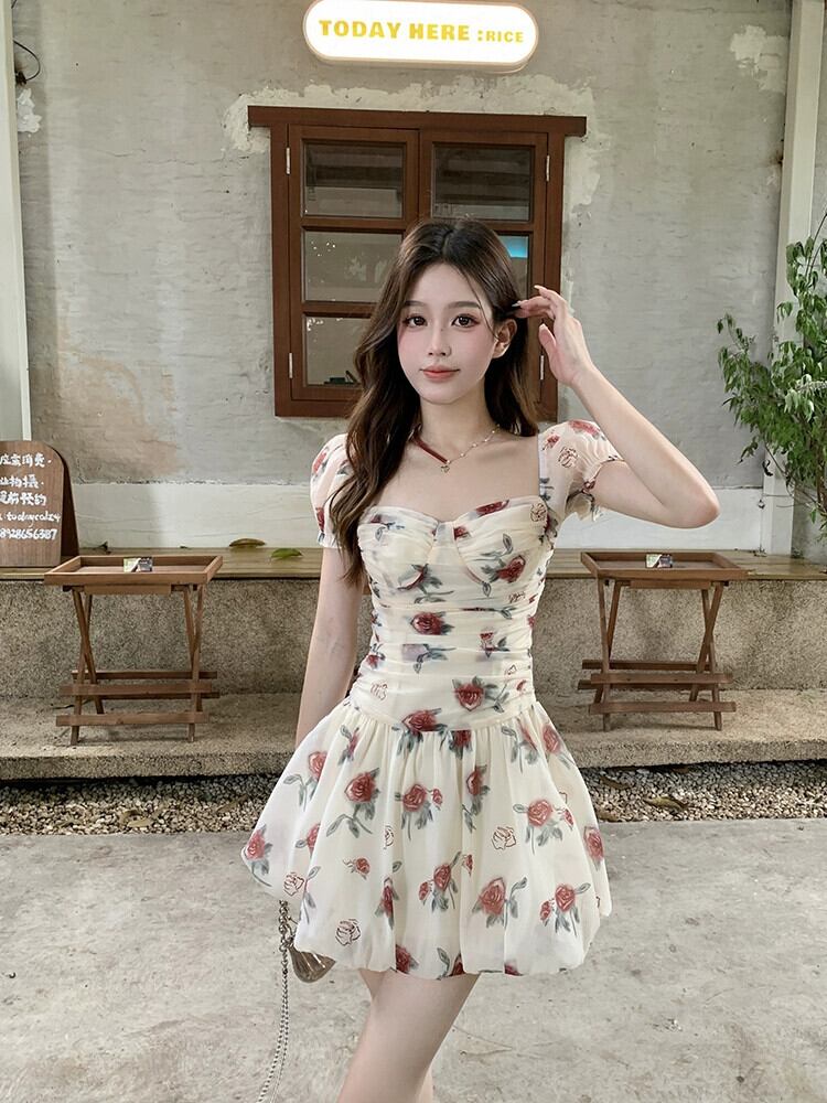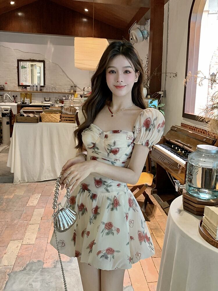 フレンチフローラルパフスリーブドレスレディース夏レトロウエストフォールドスクエアネックAラインスカート サマー 夏物 花柄 スクウェア missk42557075693