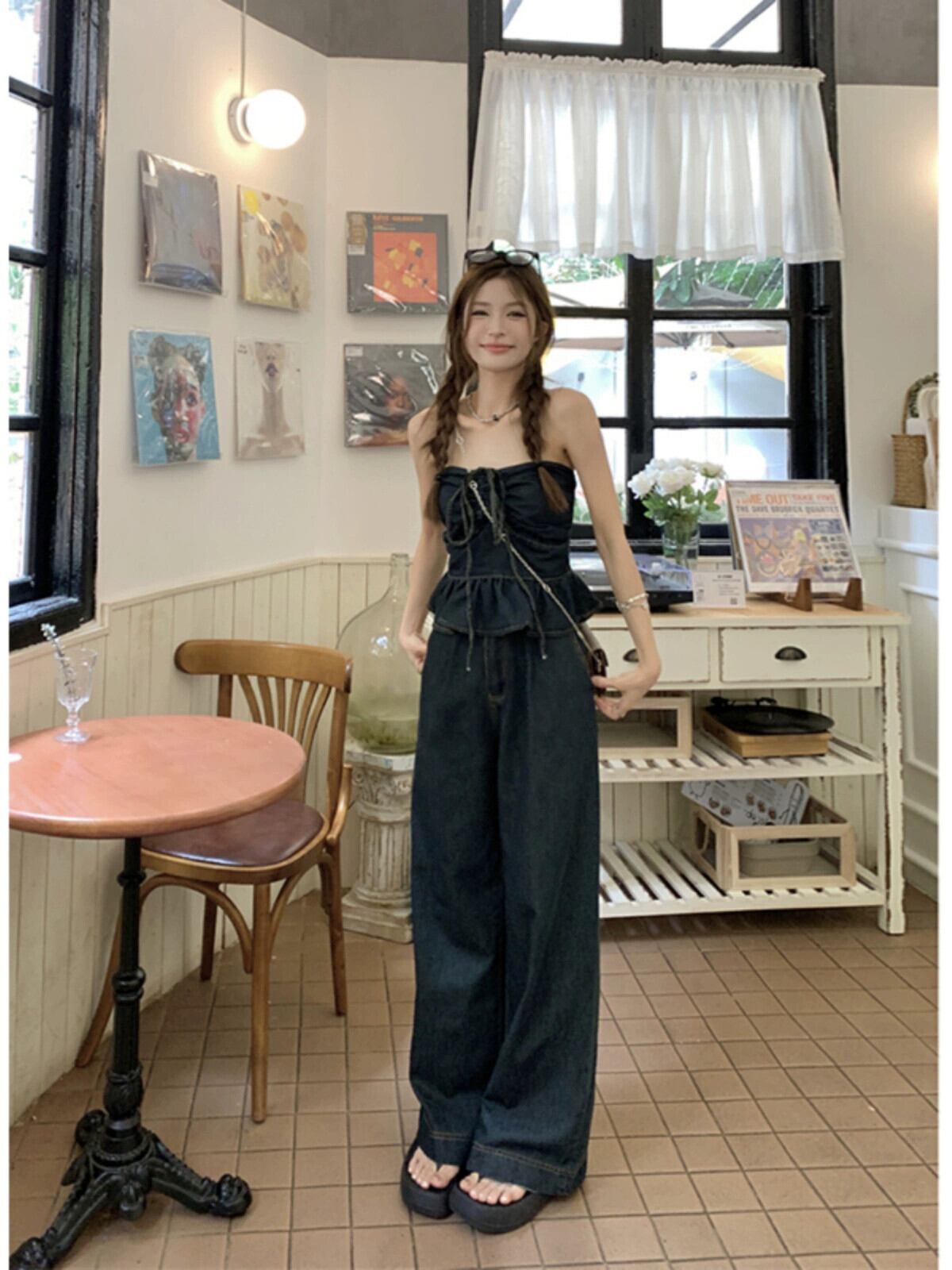 スパイスガールズセクシーなホルターネックデニムチューブトップサスペンダートップワイドレッグパンツ夏 2023 ツーピースセット サマー 夏物 ワイドパンツ missk91762623181