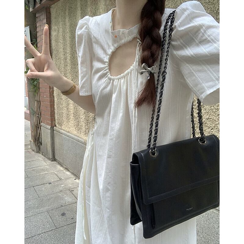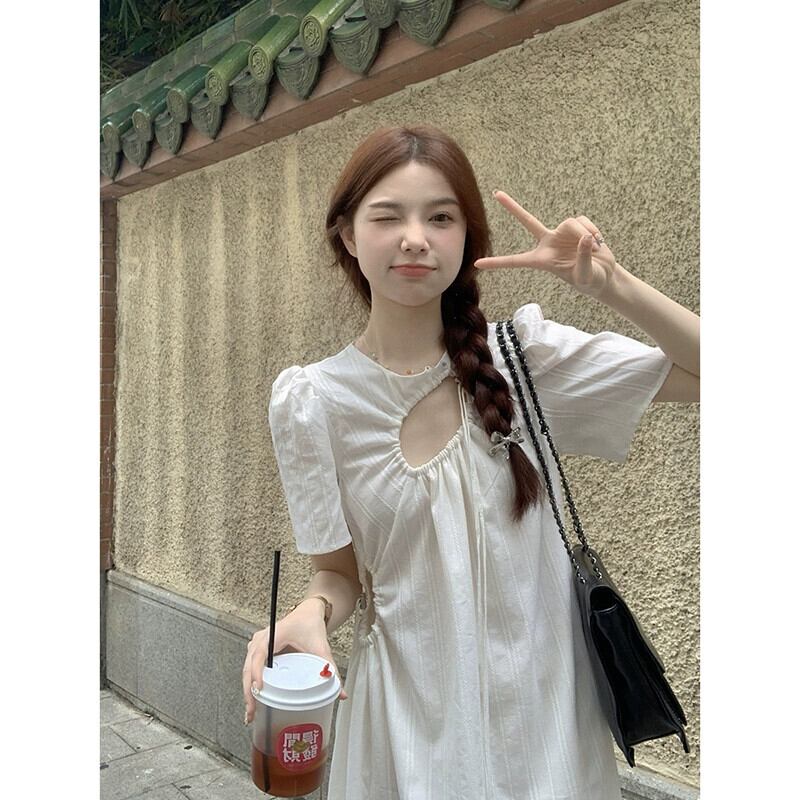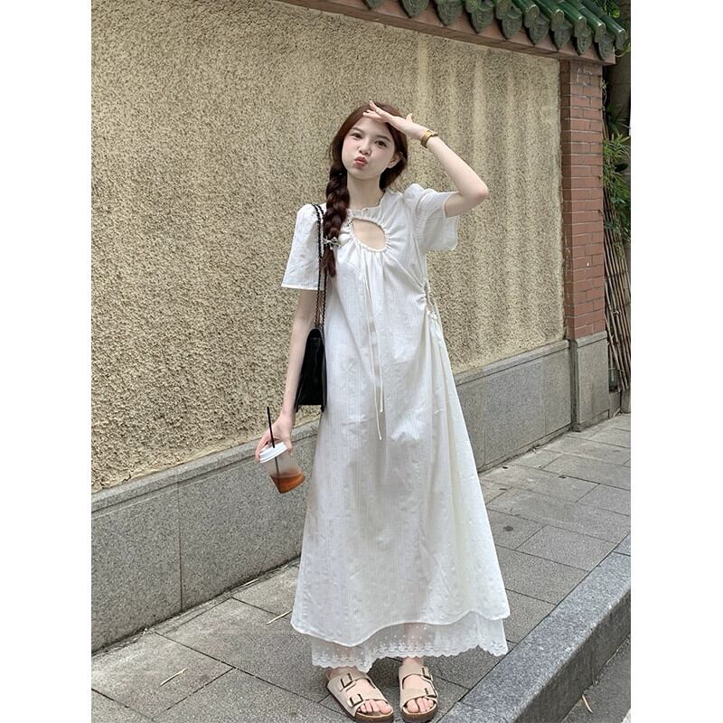 白いドレスの女性の2023年の夏の新しいスタイルの中空巾着デザインの高級感のあるフレンチロングスカート ホワイト サマー 夏物 missk57038580426