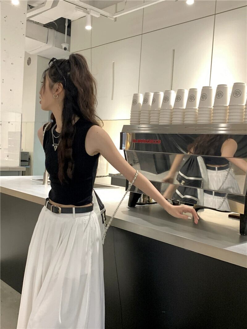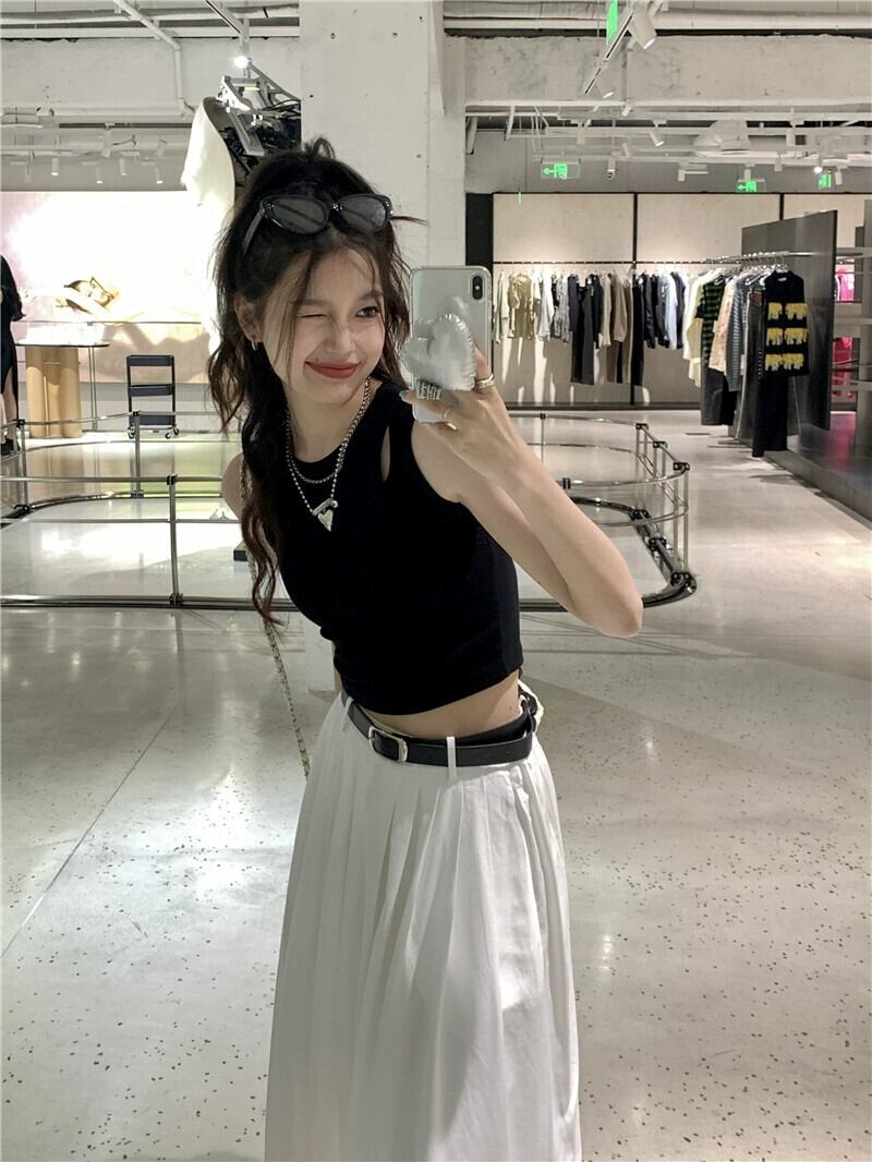 色:ベルト付き白アンブレラスカート,カットアウトブラックベスト