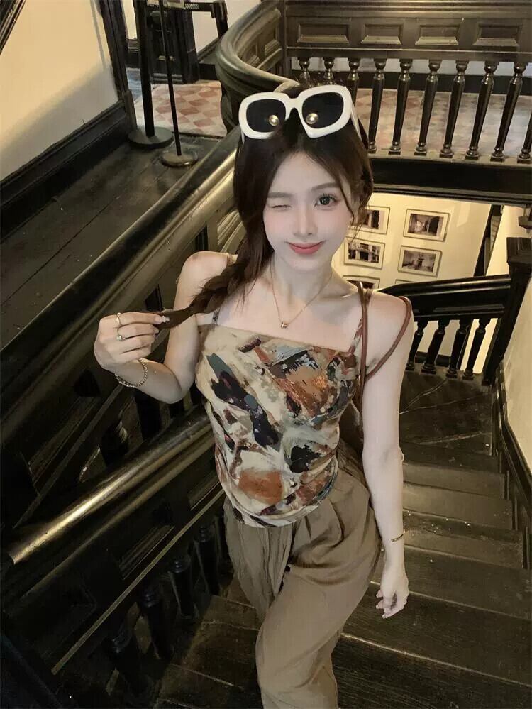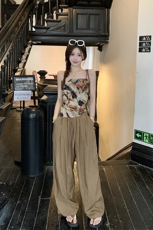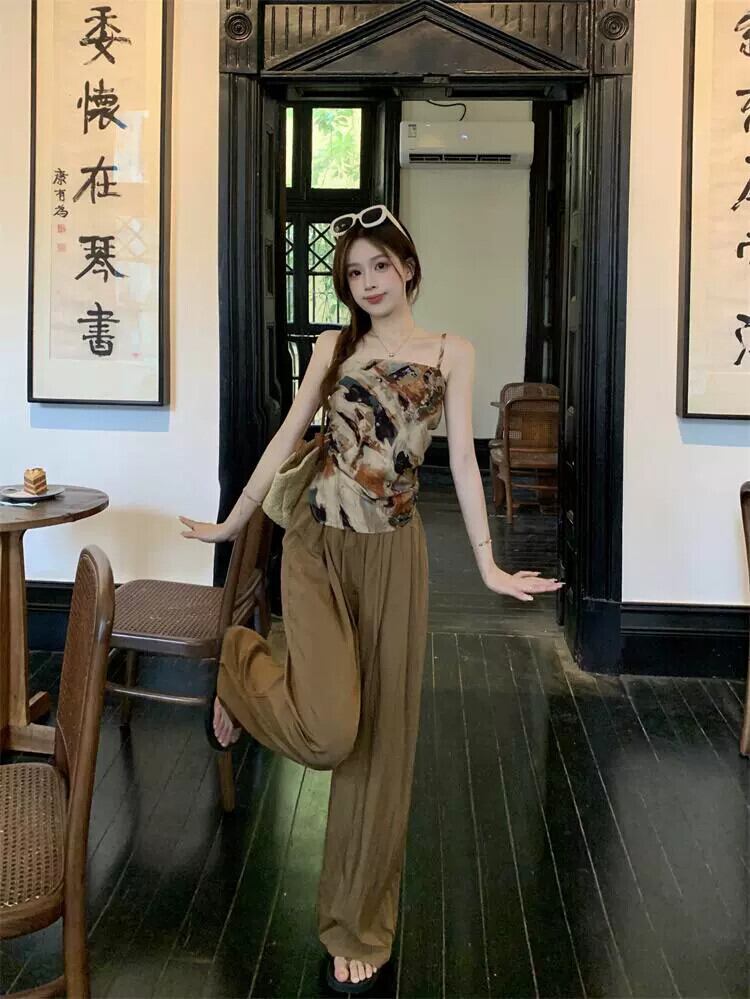 -エンドプリント蝶結びバックレスキャミソールワイドレッグストレートパンツレディース2023年夏新作2点セット リボン サマー 夏物 missk96193935672