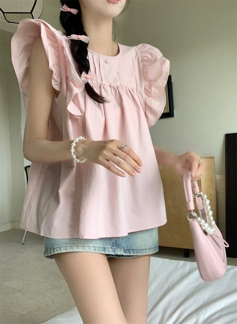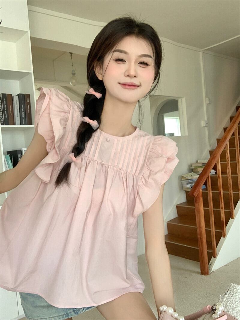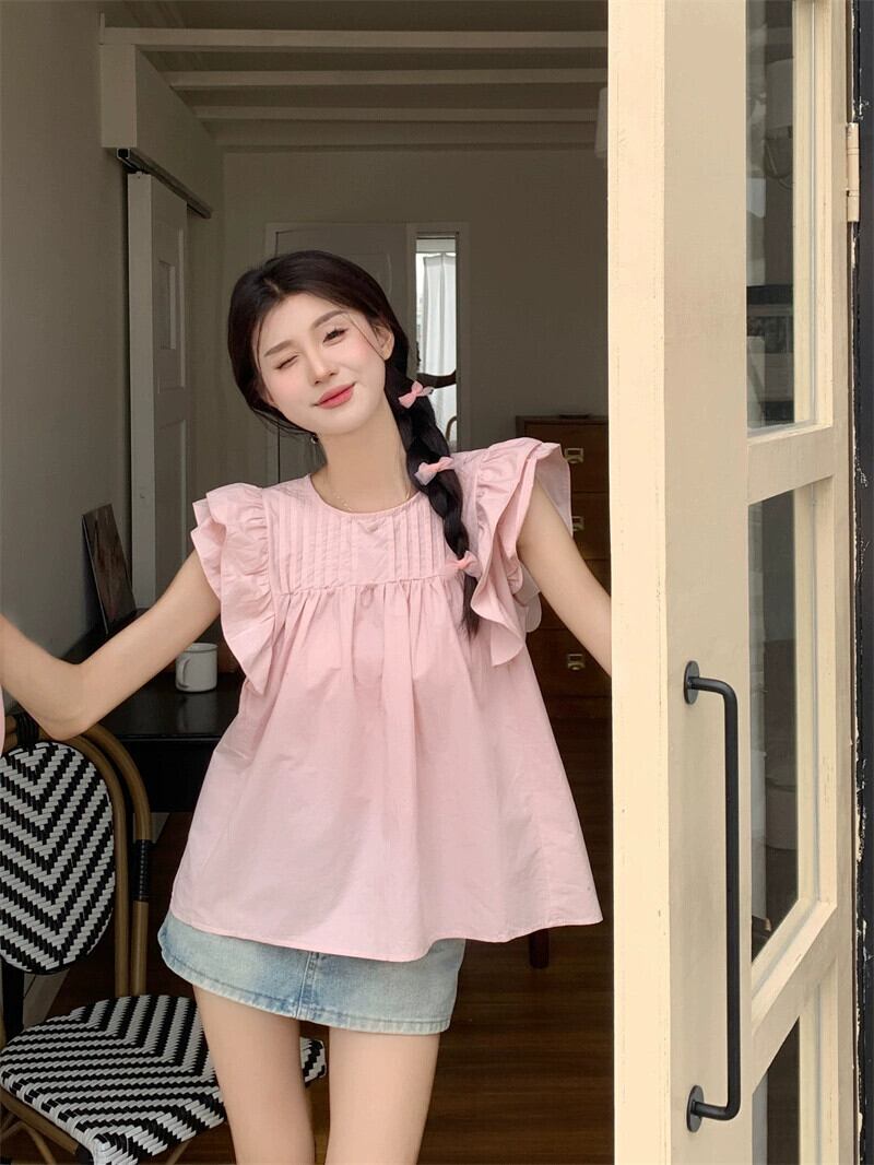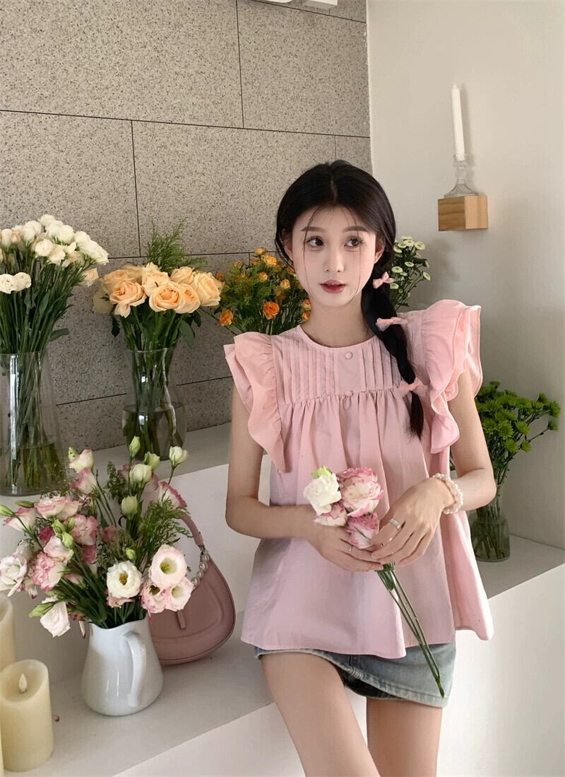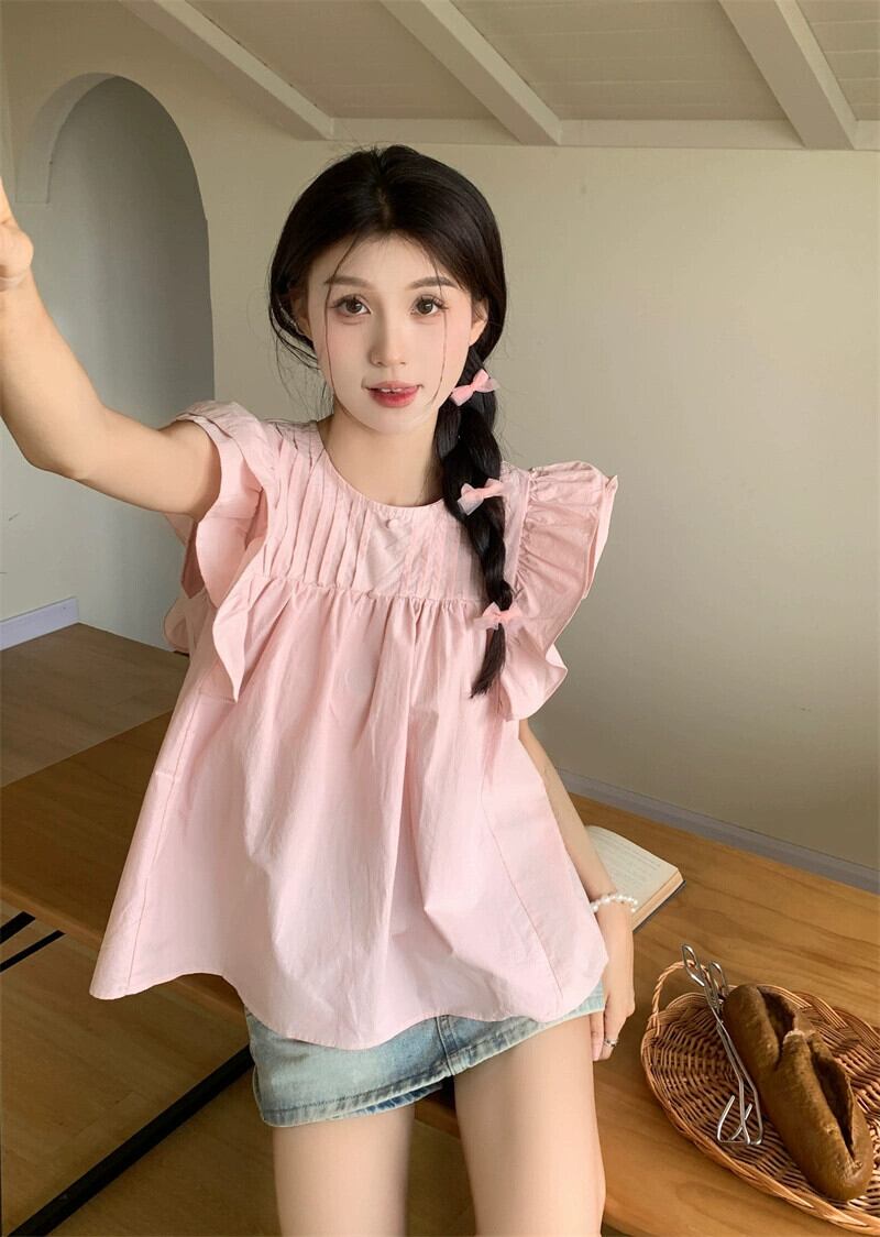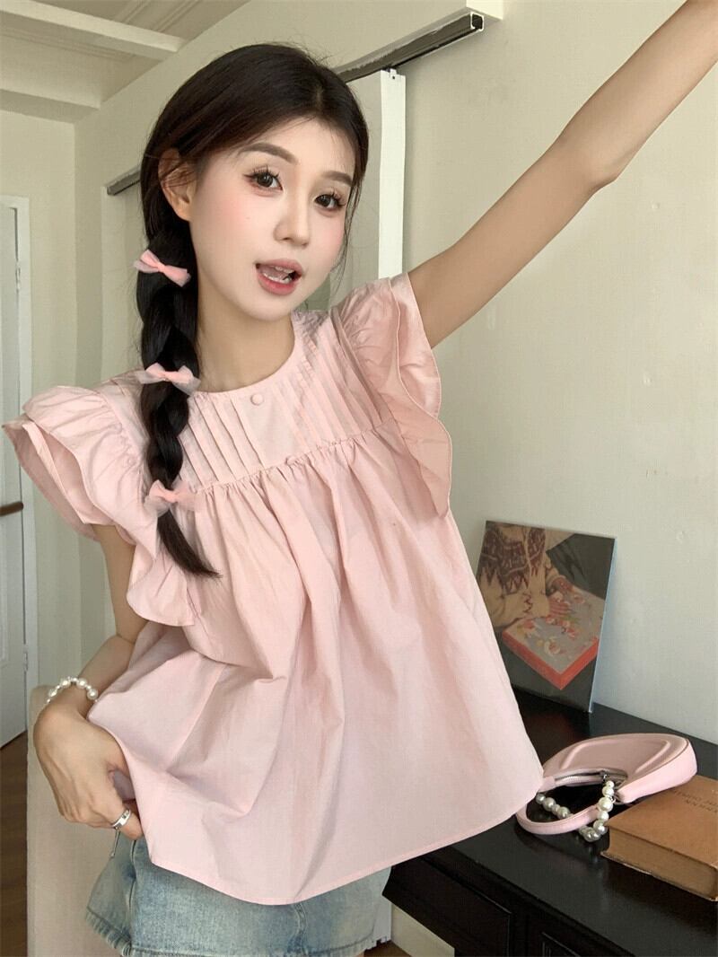 甘い木耳サイド小さなフライング スリーブ シャツ女性の夏の新しいファッション デザイン感年齢軽減ルーズ オールマッチ ピンク トップ 大人ガーリー スウィート キュート カジュアル サマー 夏物 missk51383431519