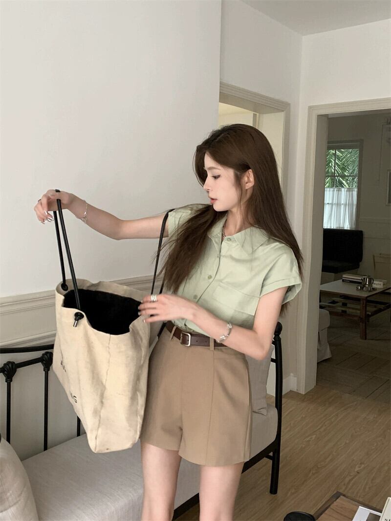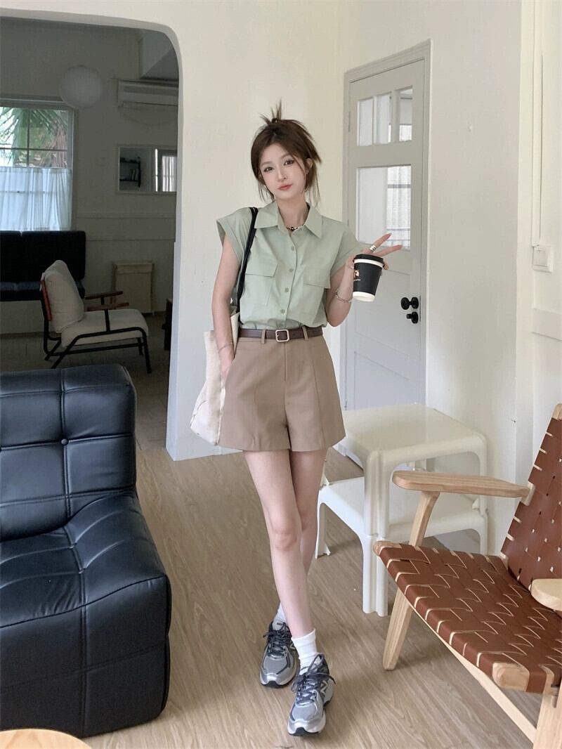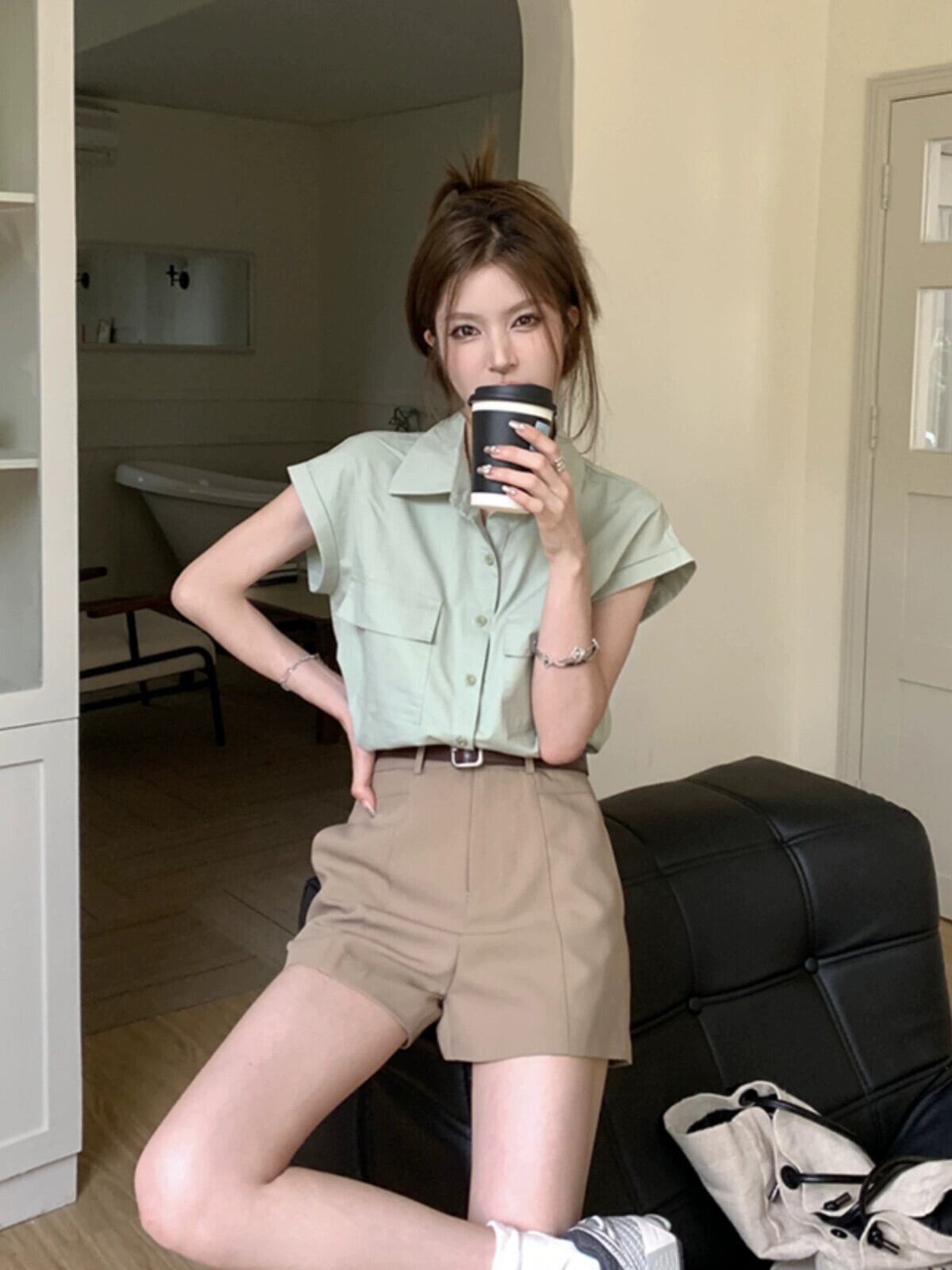 ポロ襟甘いクールルーズ半袖シャツカジュアルスーツワイドレッグショーツ女性の夏の 2023 新しいファッションスーツ 大人ガーリー スウィート キュート サマー 夏物 ブルマー missk21521212957