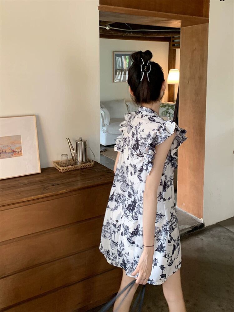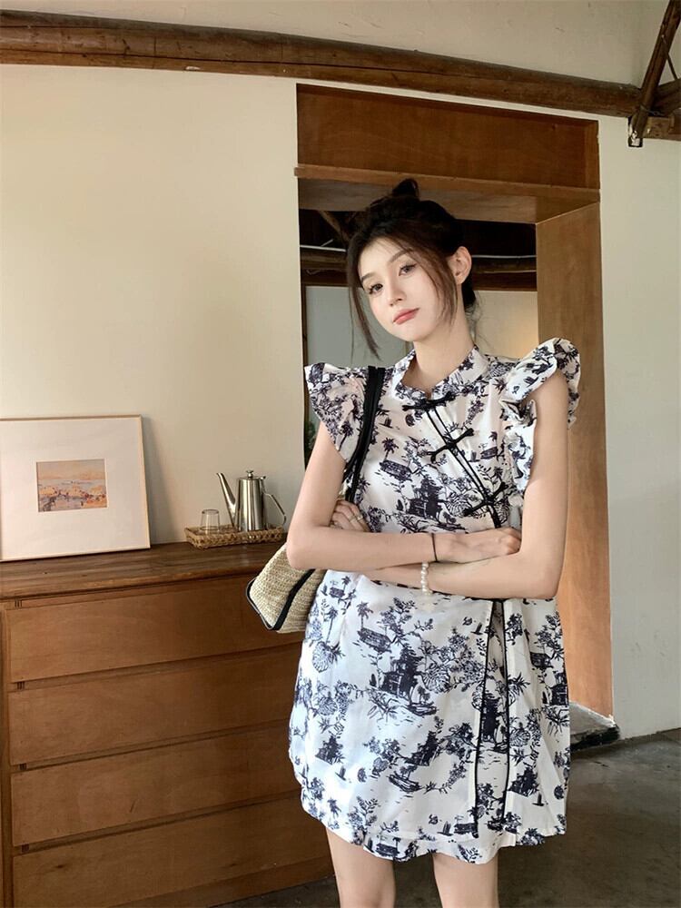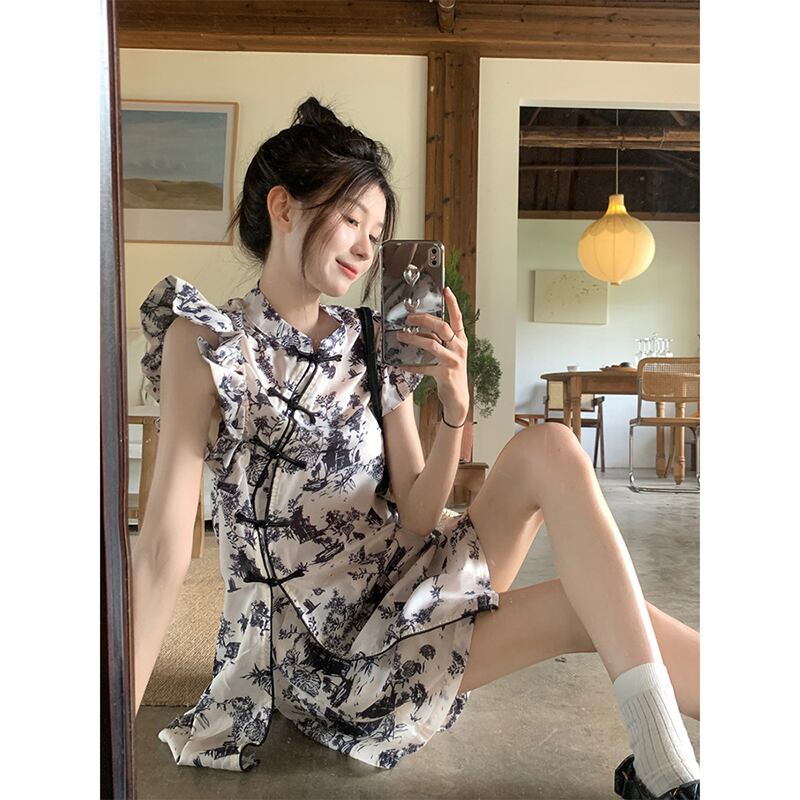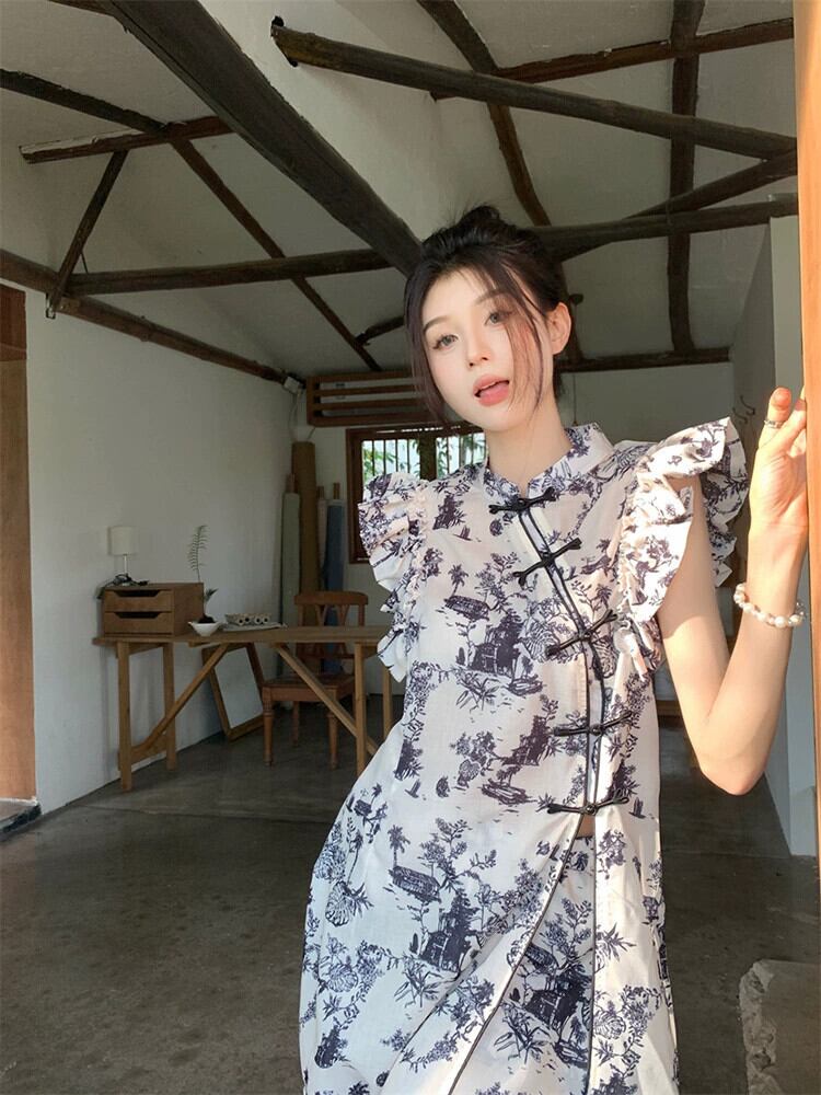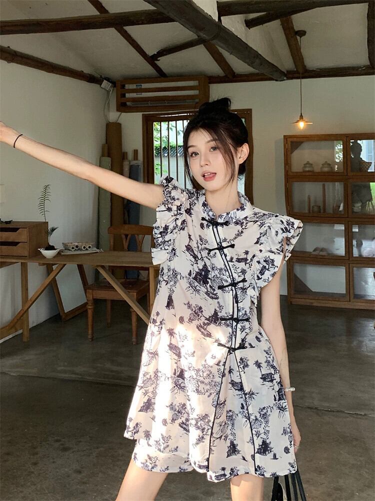 中国風バックル水墨画デザインセンスフェイフェイスリーブシャツ + ハイウエストショーツ女性の夏の新しいツーピーススーツ ハイウェスト サマー 夏物 ブルマー missk527473119
