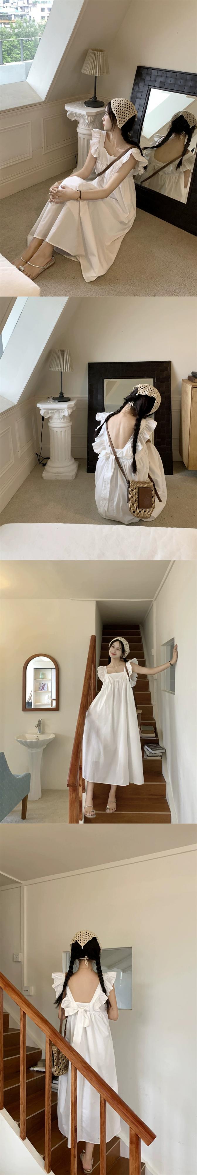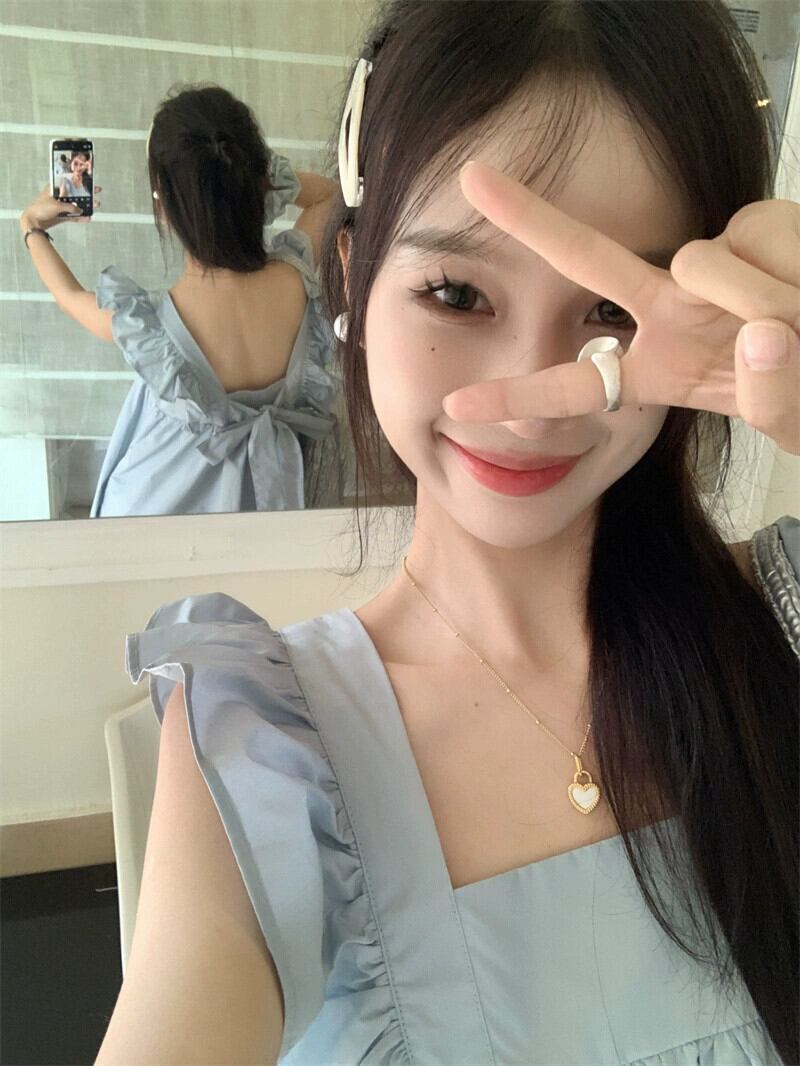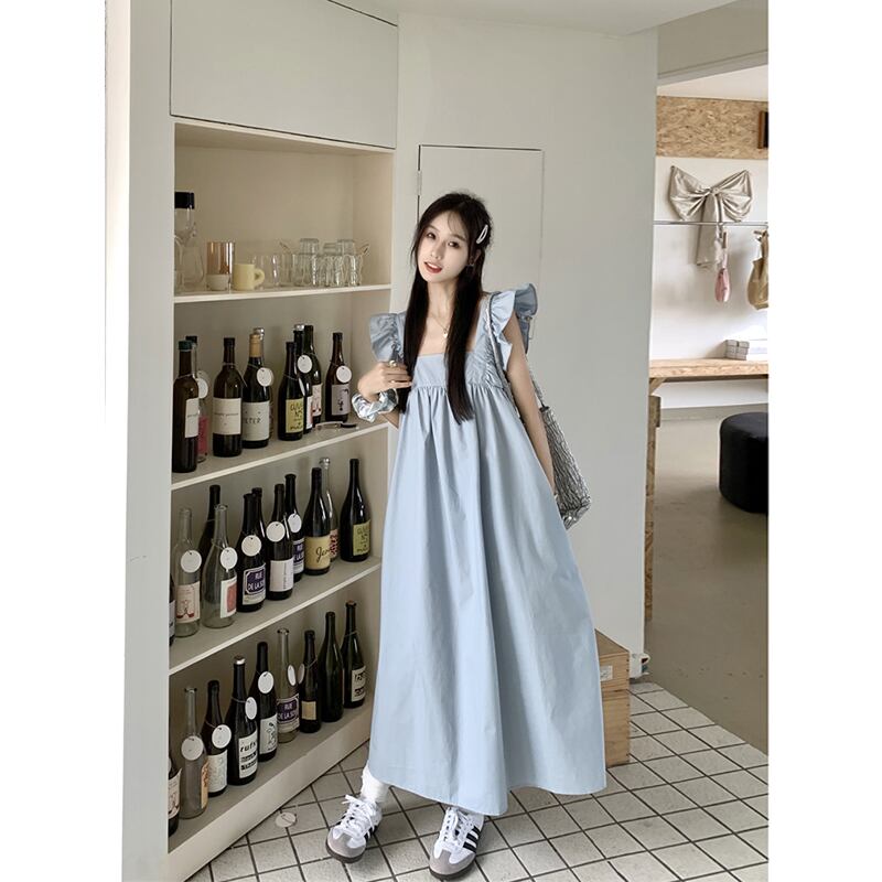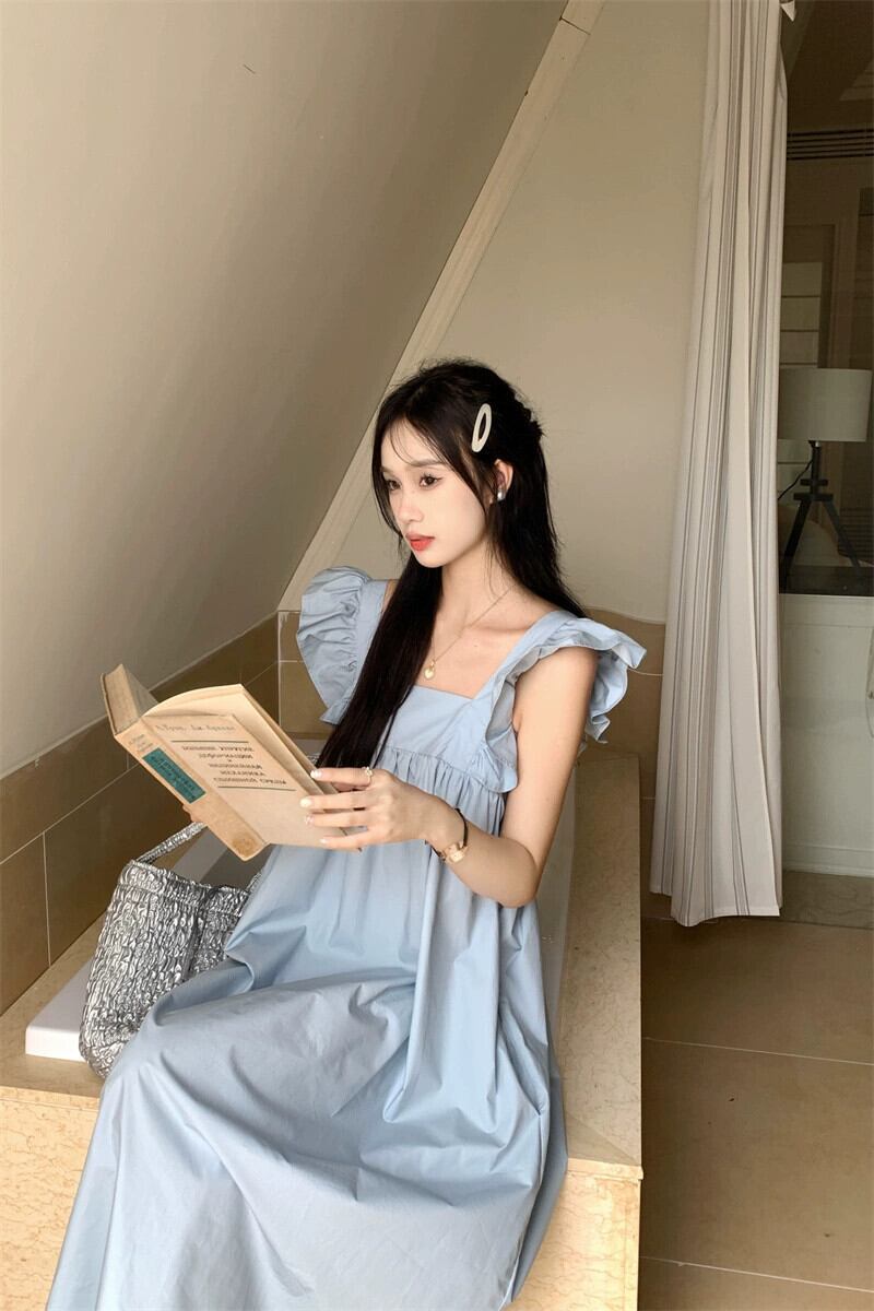 新鮮なスクエアカラーフライングスリーブドレス女性の夏の新しいファッションリボンデザインシックなブルーロングスカート サマー 夏物 スクウェア missk92208724040