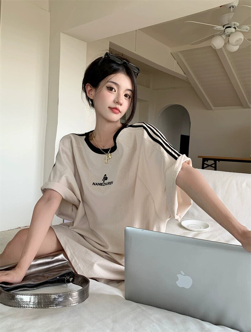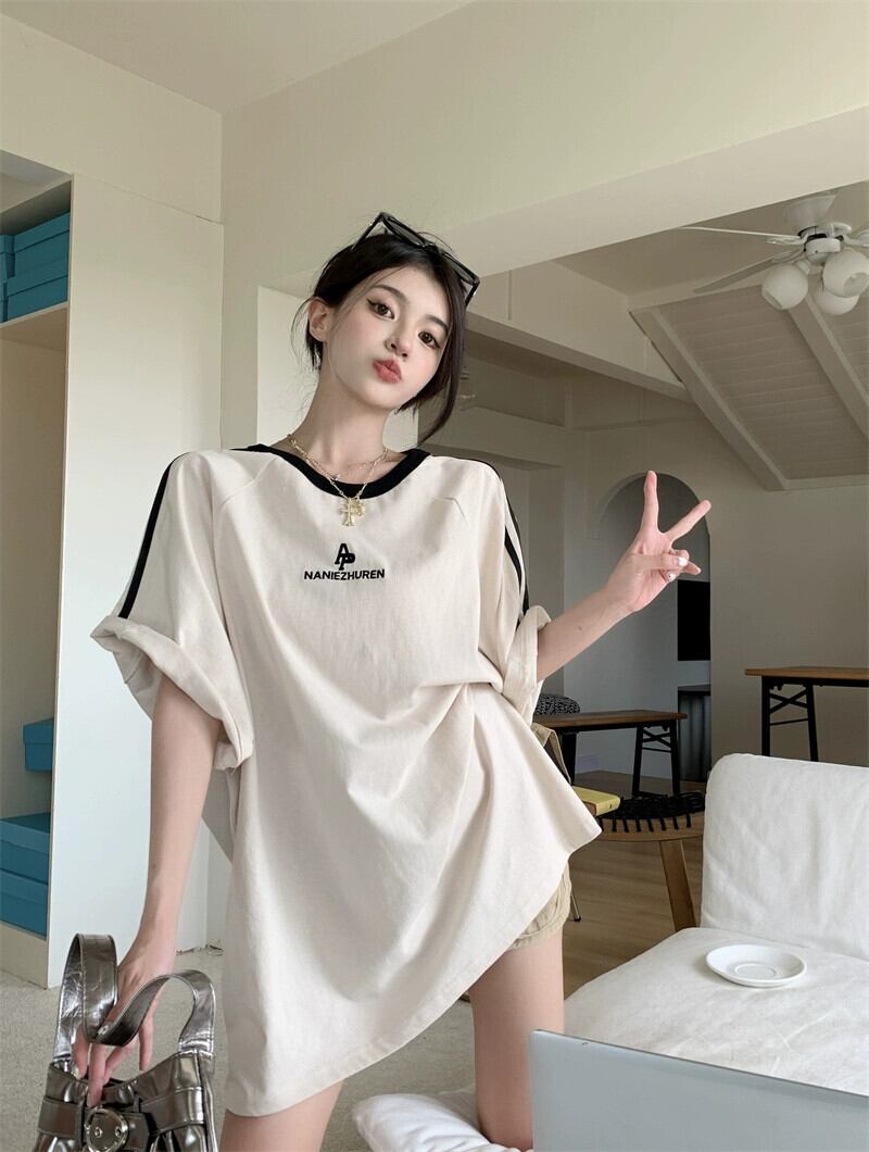 ストライプカラーコントラスト半袖Tシャツレディース夏バージョン2023新しいルーズミッドレングスBFスタイルレタープリントトップ サマー 夏物 missk91318778802
